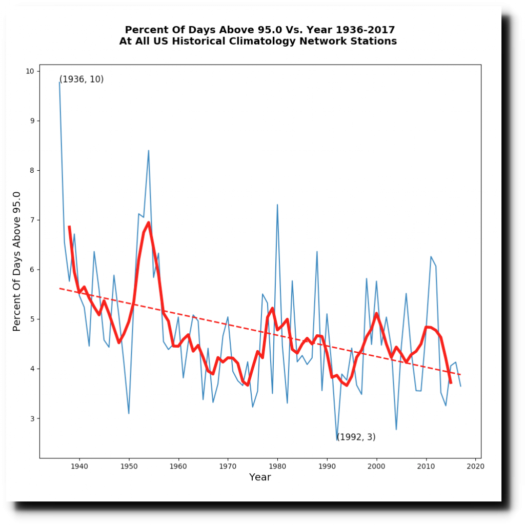 And like the Dallas-Fort Worth area, for the entire United States the frequency of hot days has plummeted over the last 82 years – as CO2 has increased.