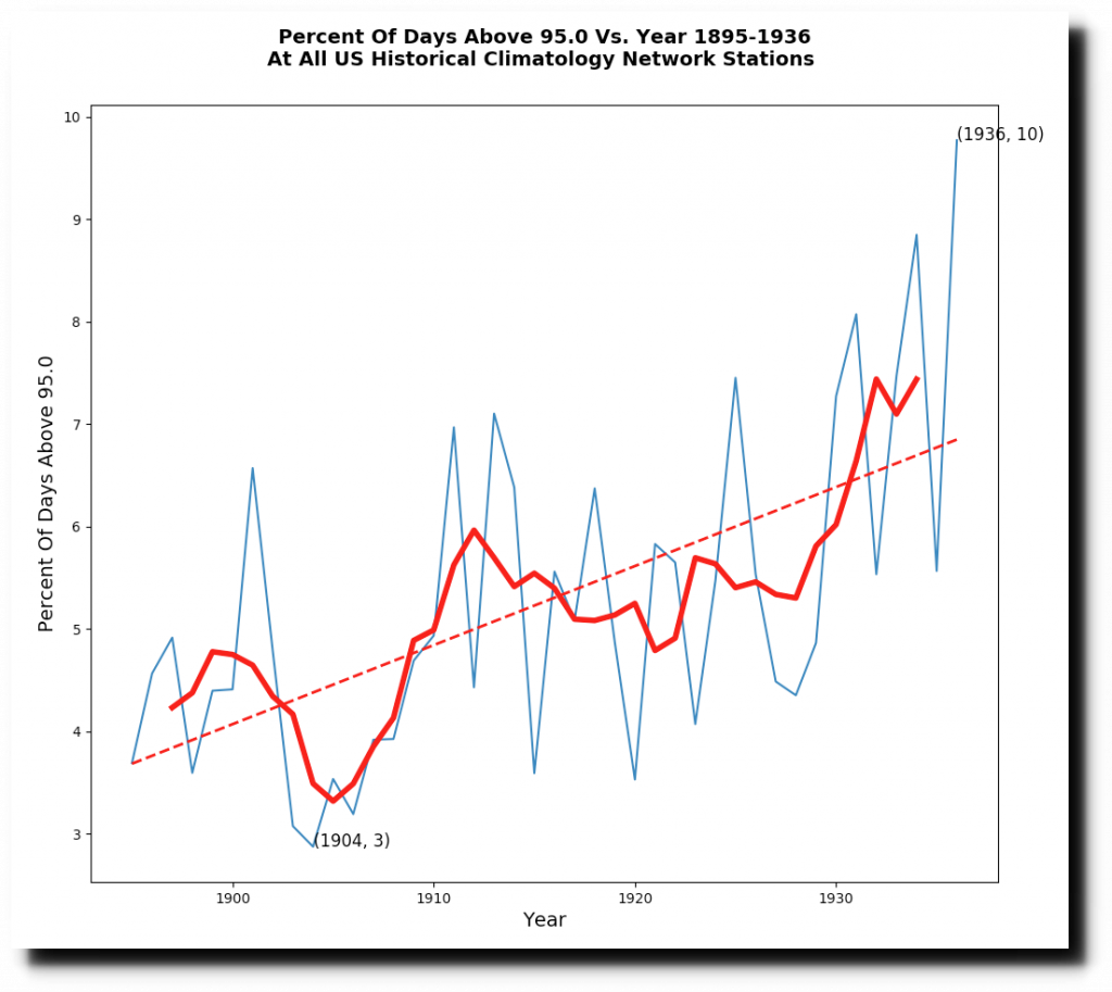 Prior to 82 years ago the US had a large increase in the number of hot days. Had people 82 years ago tried to predict the weather now based on past trends, they would have come up with exactly the wrong answer.