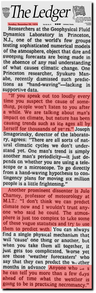 In 1974, sensible scientists were aware that natural cycles are not understood and couldn’t be modeled. They compared climate modeling to talking with the dead.