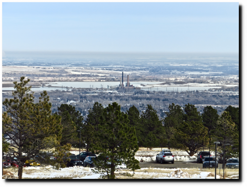 Looking down from the parking lot they saw how CO2 from the Valmont Power Plant has frozen the lake behind it.