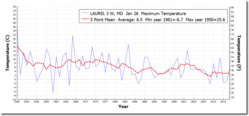 On this date in 1950, it was 78 degrees at Laurel, MD – just outside Washington DC. Since then, January 26 temperatures have plummeted. Today’s forecast is 45 degrees, which is 33 degrees cooler than 1950.