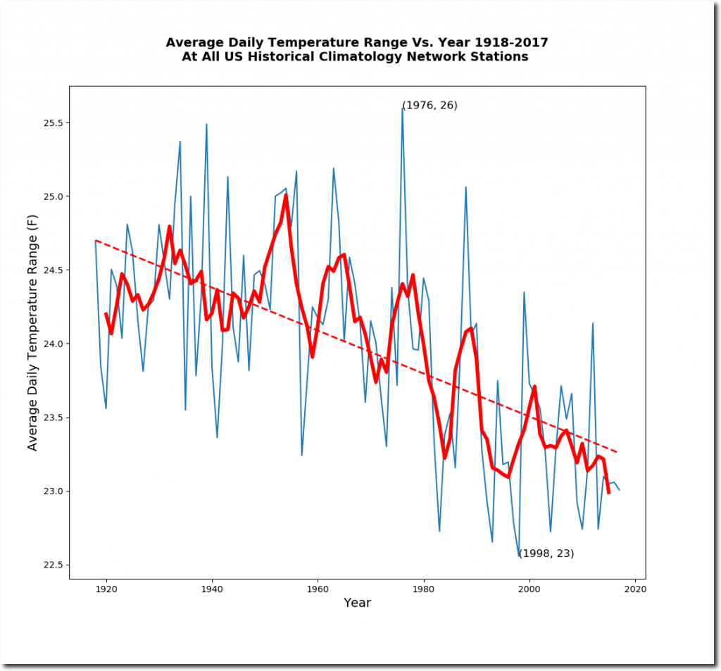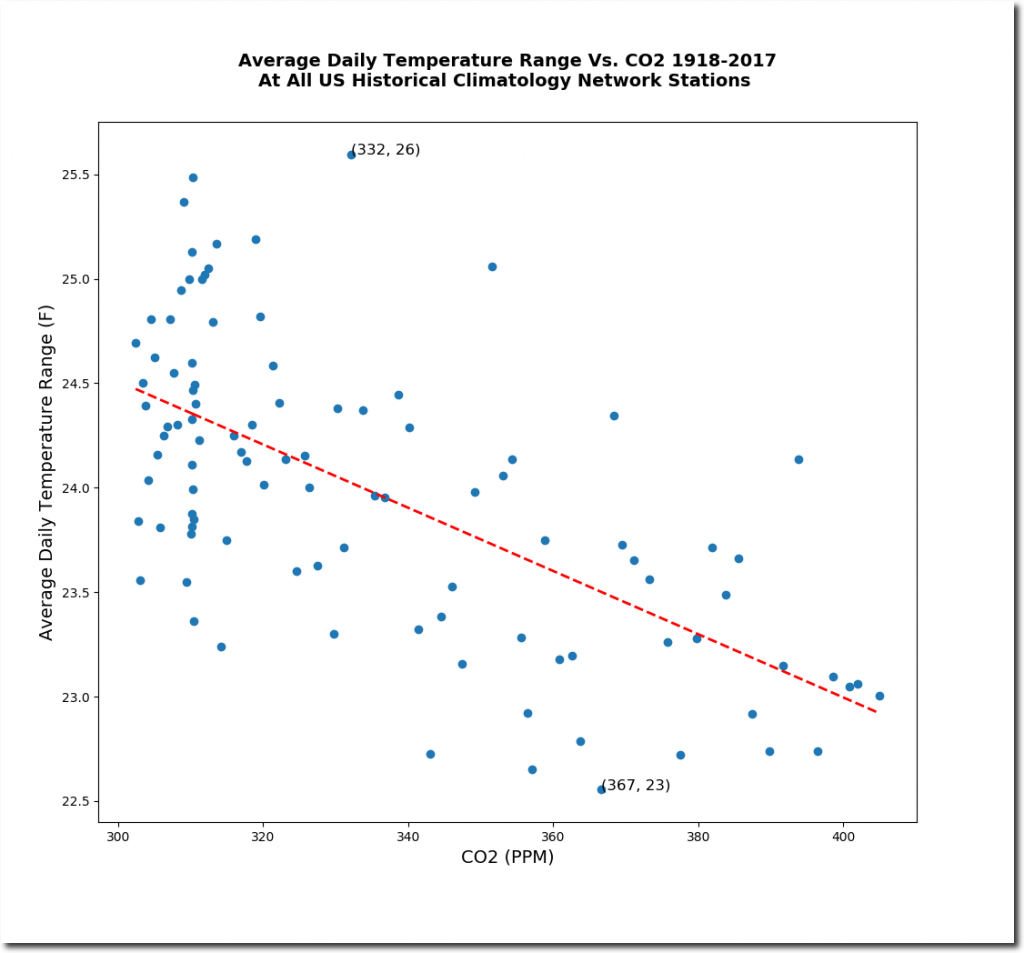 The average daily temperature range has plummeted as CO2 has increased. We are seeing many fewer extremes in temperature than we did 100 years ago.
