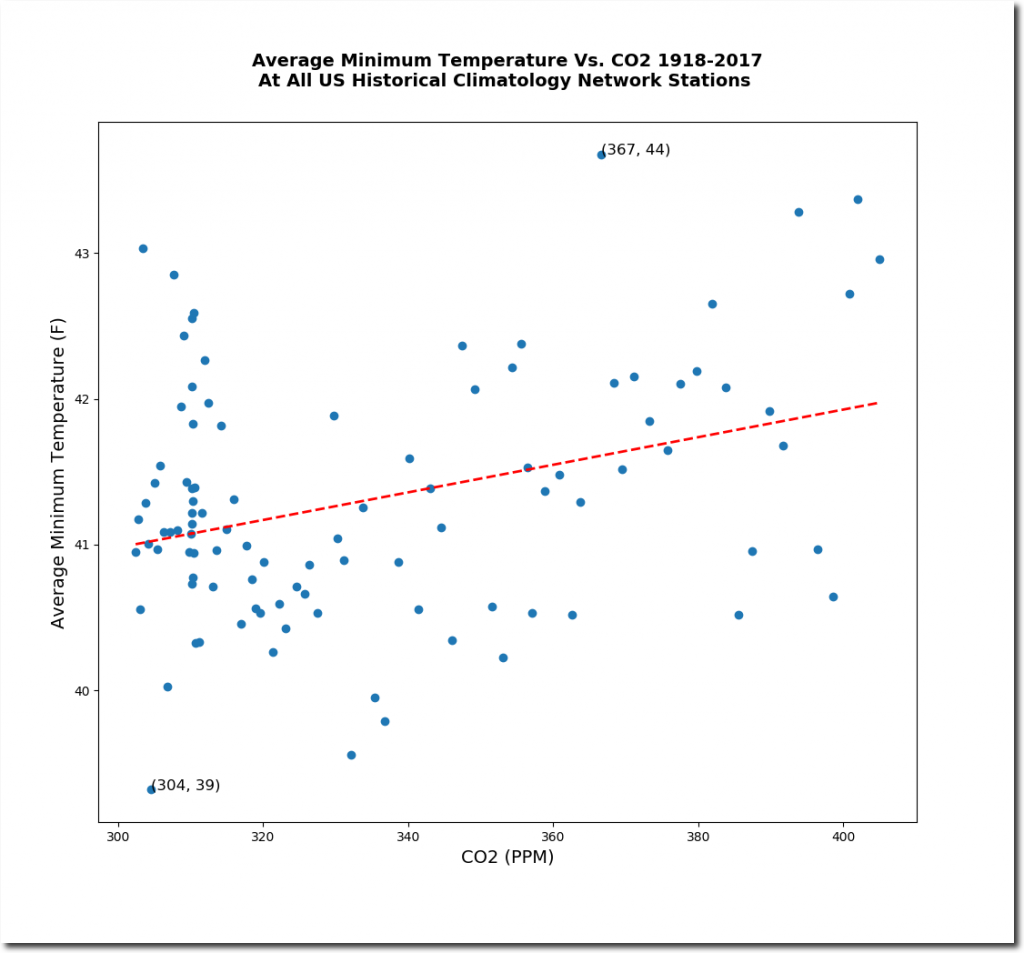 Meanwhile, the average minimum temperature has increased as CO2 has increased.