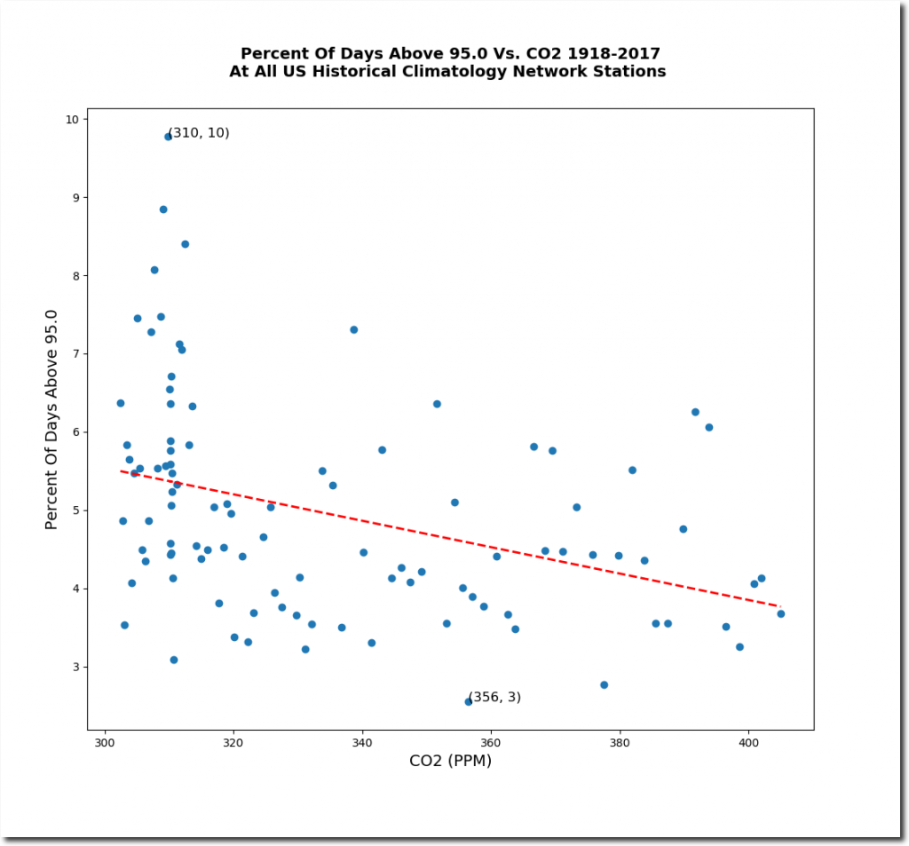 Over the past century, as CO2 has increased in the atmosphere, the frequency of hot days in the US has plummeted.