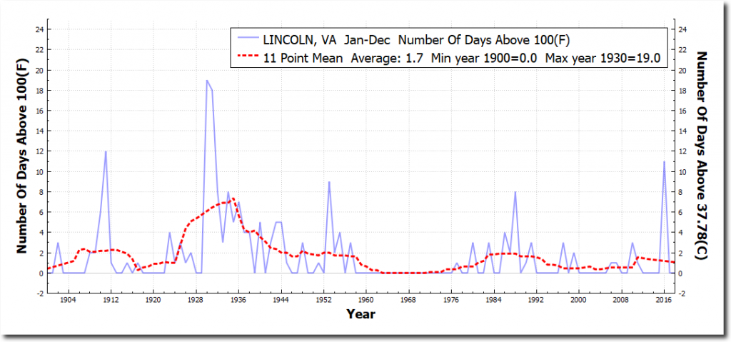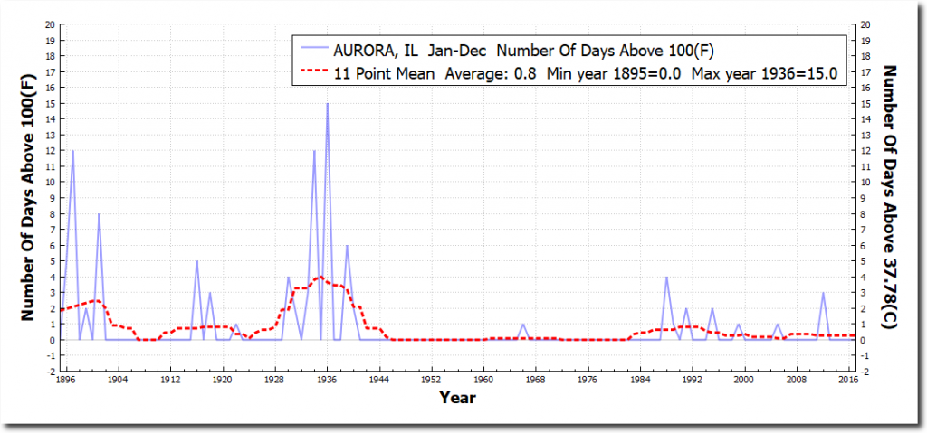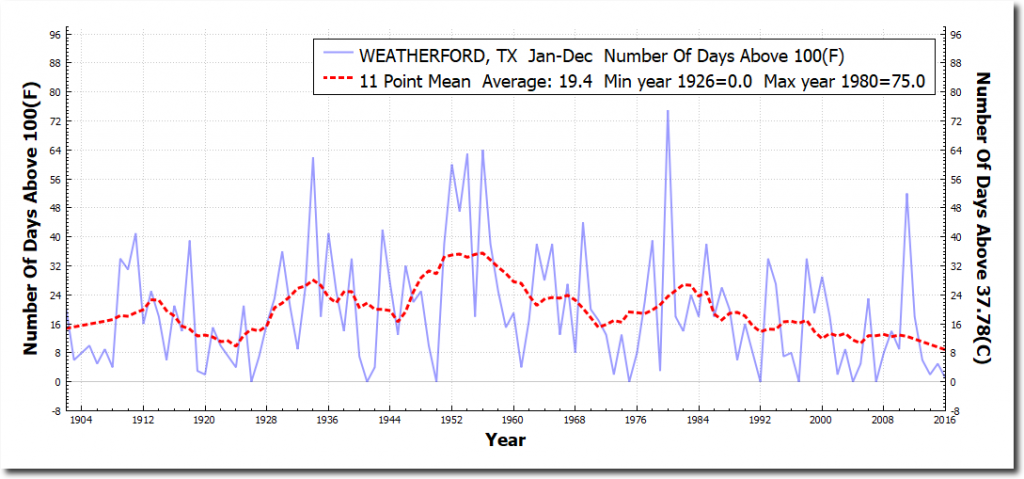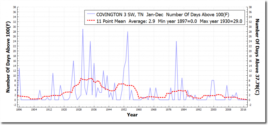 The graphs below are from the closest USHCN stations to DC, Dallas, Memphis and Chicago. All show a sharp decline in the number of 100 degree days.