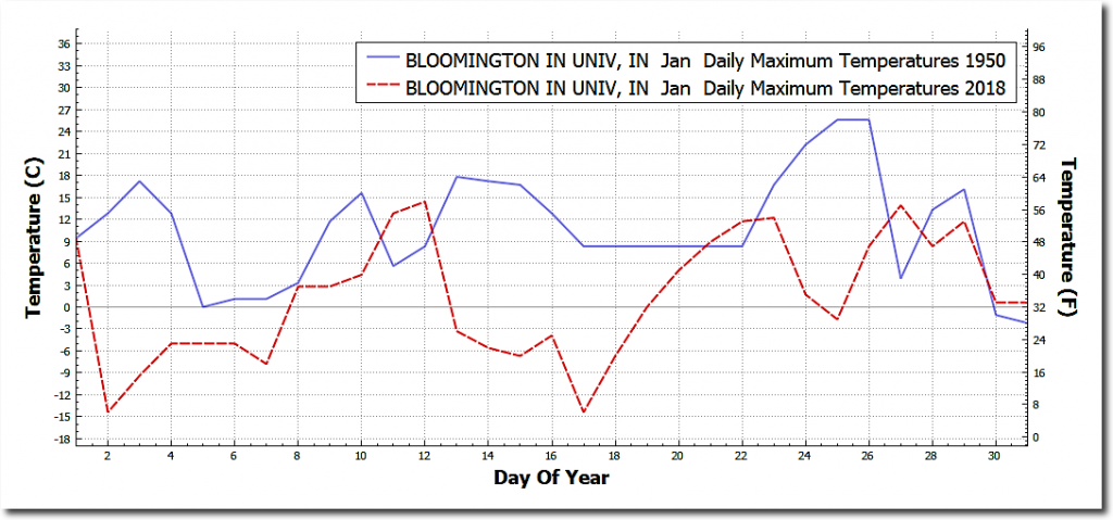 January 1950 was 18 degrees warmer than this year at Bloomington, Indiana. During January 1950, Bloomington had several days approaching 80 degrees.