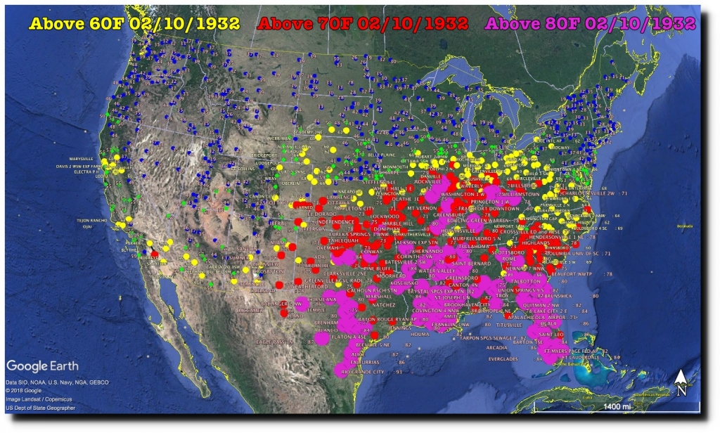 On this date in 1932, Texas was 94F, Georgia was 87F, Alabama and Florida were 86F, Louisiana and Mississippi were 85F, Arkansas and Oklahoma were 84F, Illinois was 83F and Indiana was 81F. If we had temperatures like that now, scientists would demand immediate world communism.