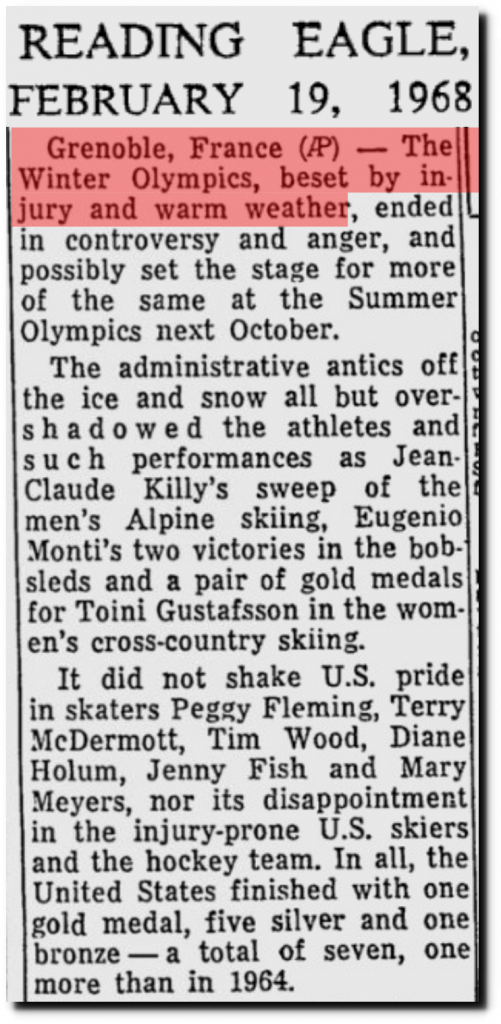 This week in 1968, Jean Claude Killy won the Olympic slalom, giant slalom and downhill, and Peggy Fleming took the gold medal in figure skating – in an Olympics which was so warm they had to do the bobsled racing at night.