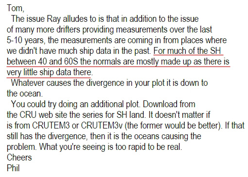 Dr. Phil Jones, overseer of the Climate Research Unit temperature data, even admitted in an intercepted e-mail that the sea surface temperature data in the Southern Hemisphere temperature record are “mostly made up”.