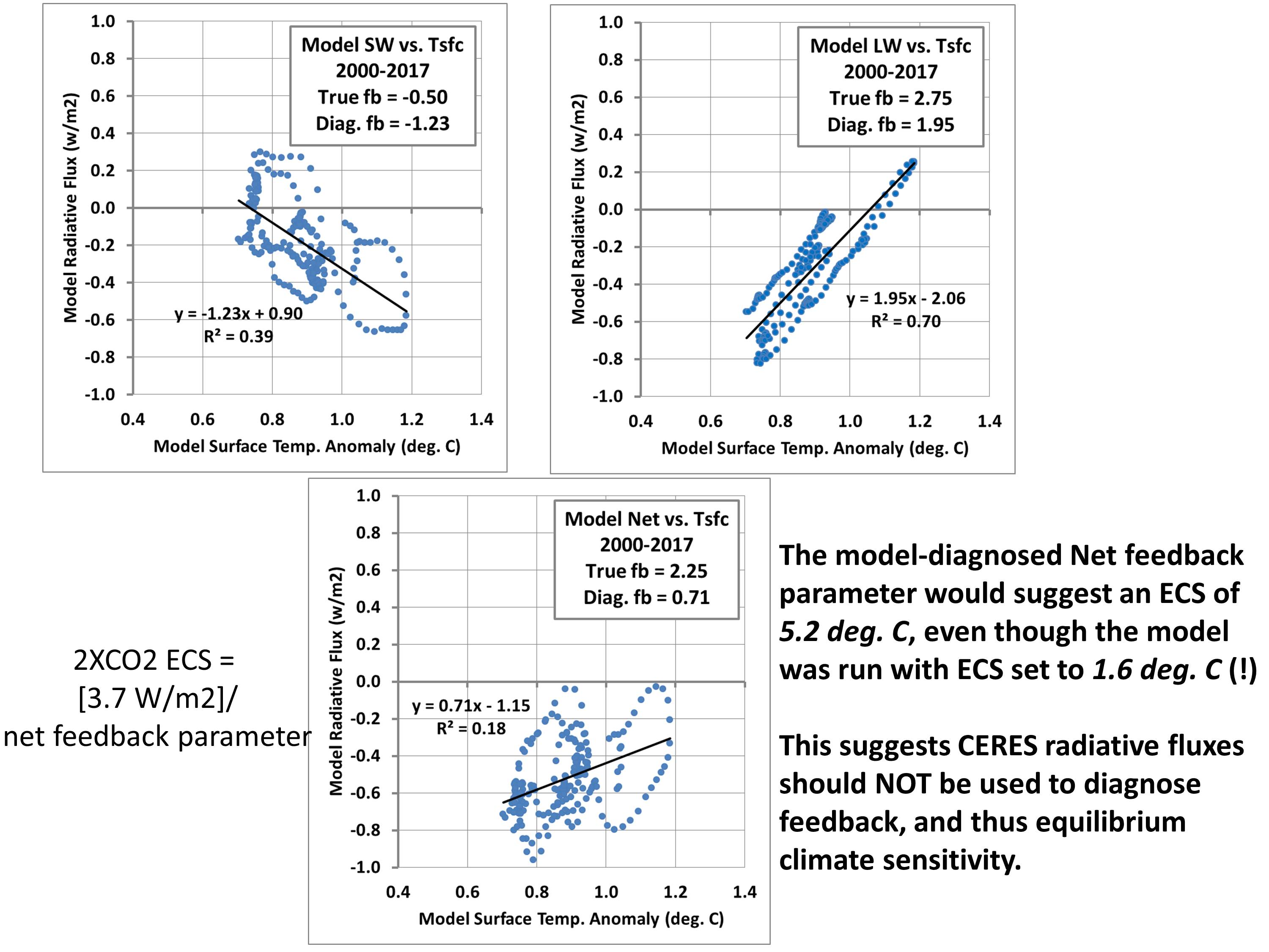 The ECS thus (incorrectly) diagnosed from the model radiative fluxes is 5.2 deg. C, even though the feedbacks specified in the model have an ECS of 1.6 deg. C! Thus supports our contention that use of CERES radiative fluxes to estimate ECS will lead to overestimation of climate sensitivity (e.g. Spencer & Braswell, 2011). The cause of the problem is time-varying radiative forcing internal to the climate system contaminating the radiative feedback signal.