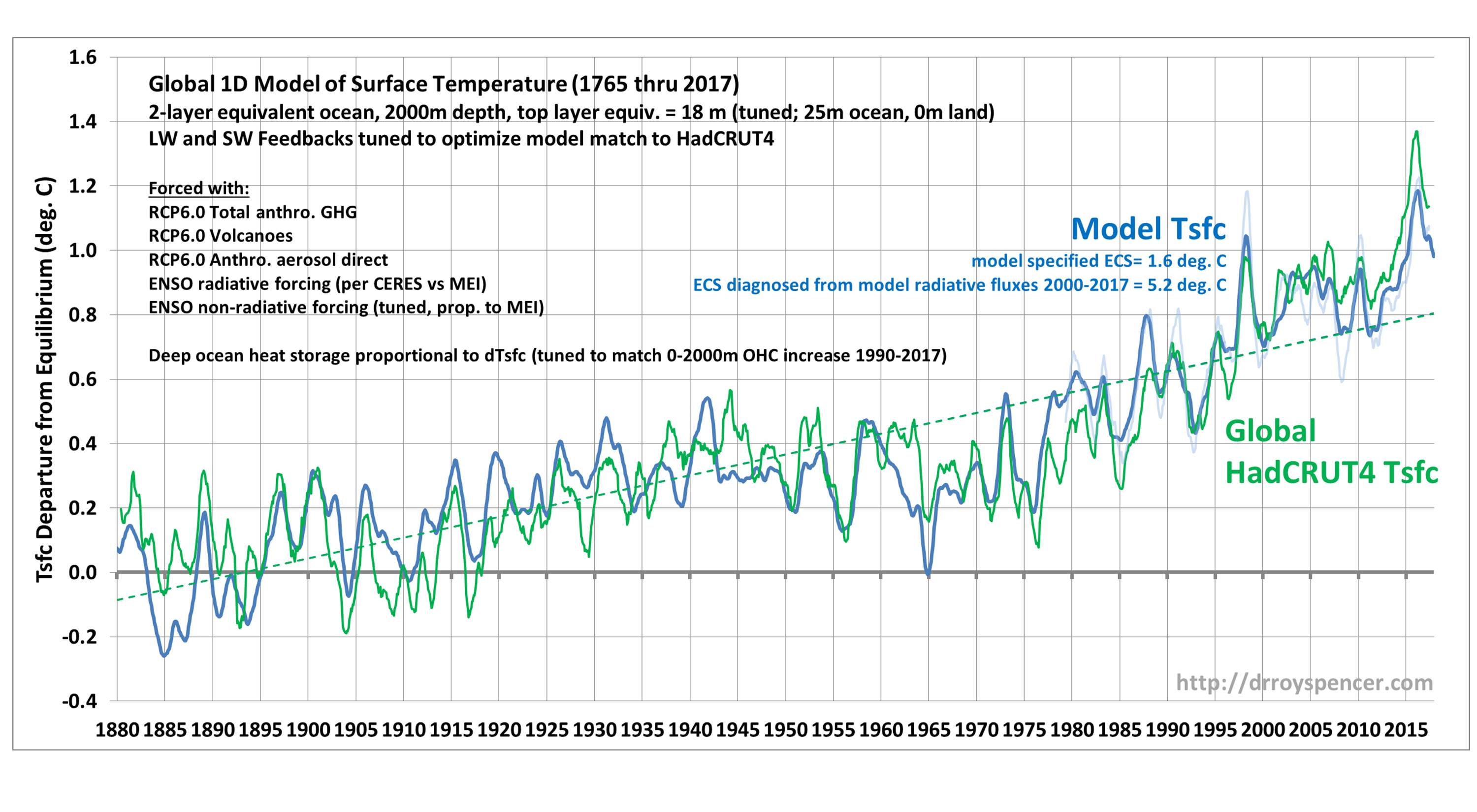 The 1D model fit to the HadCRUT4 data is quite good, despite the simplicity of the model. The model climate sensitivity of only 1.6 deg. C is just within the IPCCs likely ECS range of 1.5 to 4.5 deg. C.