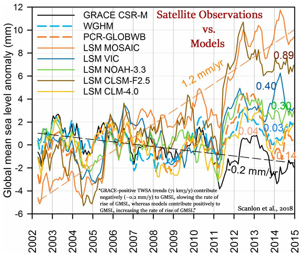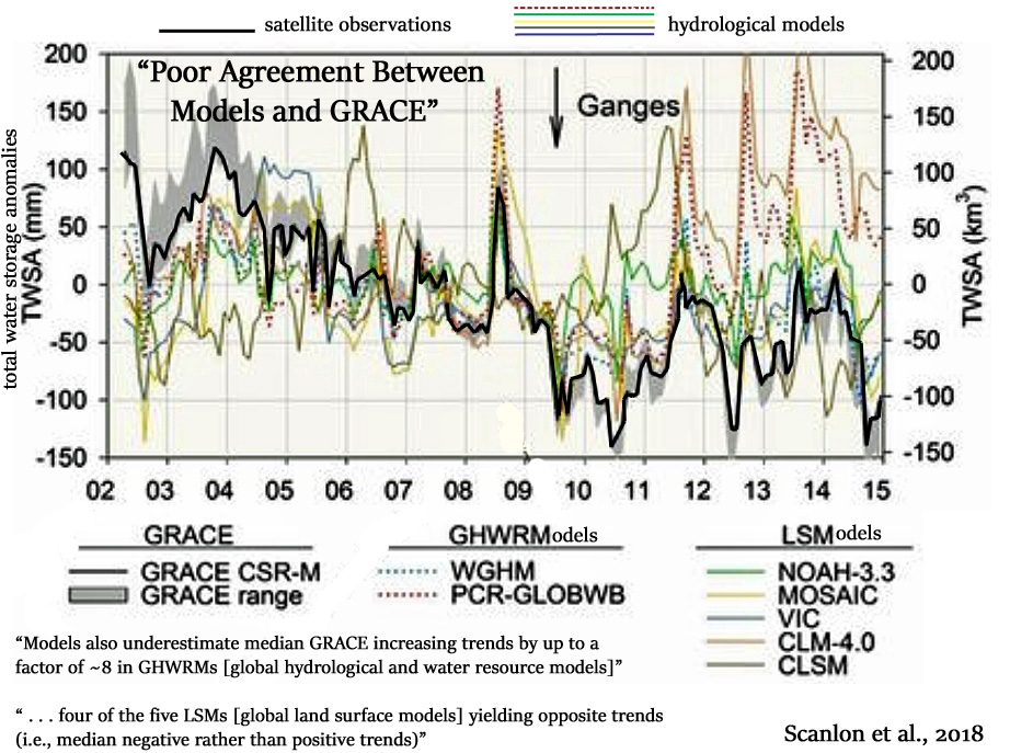 Scanlon et al., 2018 The models underestimate the large decadal (2002–2014) trends in water storage relative to GRACE satellites, both decreasing trends related to human intervention and climate and increasing trends related primarily to climate variations. The poor agreement between models and GRACE underscores the challenges remaining for global models to capture human or climate impacts on global water storage trends. … Increasing TWSA [total water storage anomalies] trends are found primarily in nonirrigated basins, mostly in humid regions, and may be related to climate variations. Models also underestimate median GRACE increasing trends (1.6–2.1 km3/y) by up to a factor of ∼8 in GHWRMs [global hydrological and water resource models] (0.3–0.6 km3/y). Underestimation of GRACE-derived TWSA increasing trends is much greater for LSMs [global land surface models], with four of the five LSMs [global land surface models] yielding opposite trends (i.e., median negative rather than positive trends) … Increasing GRACE trends are also found in surrounding basins, with most models yielding negative trends. Models greatly underestimate the increasing trends in Africa, particularly in southern Africa. .. TWSA trends from GRACE in northeast Asia are generally increasing, but many models show decreasing trends, particularly in the Yenisei.