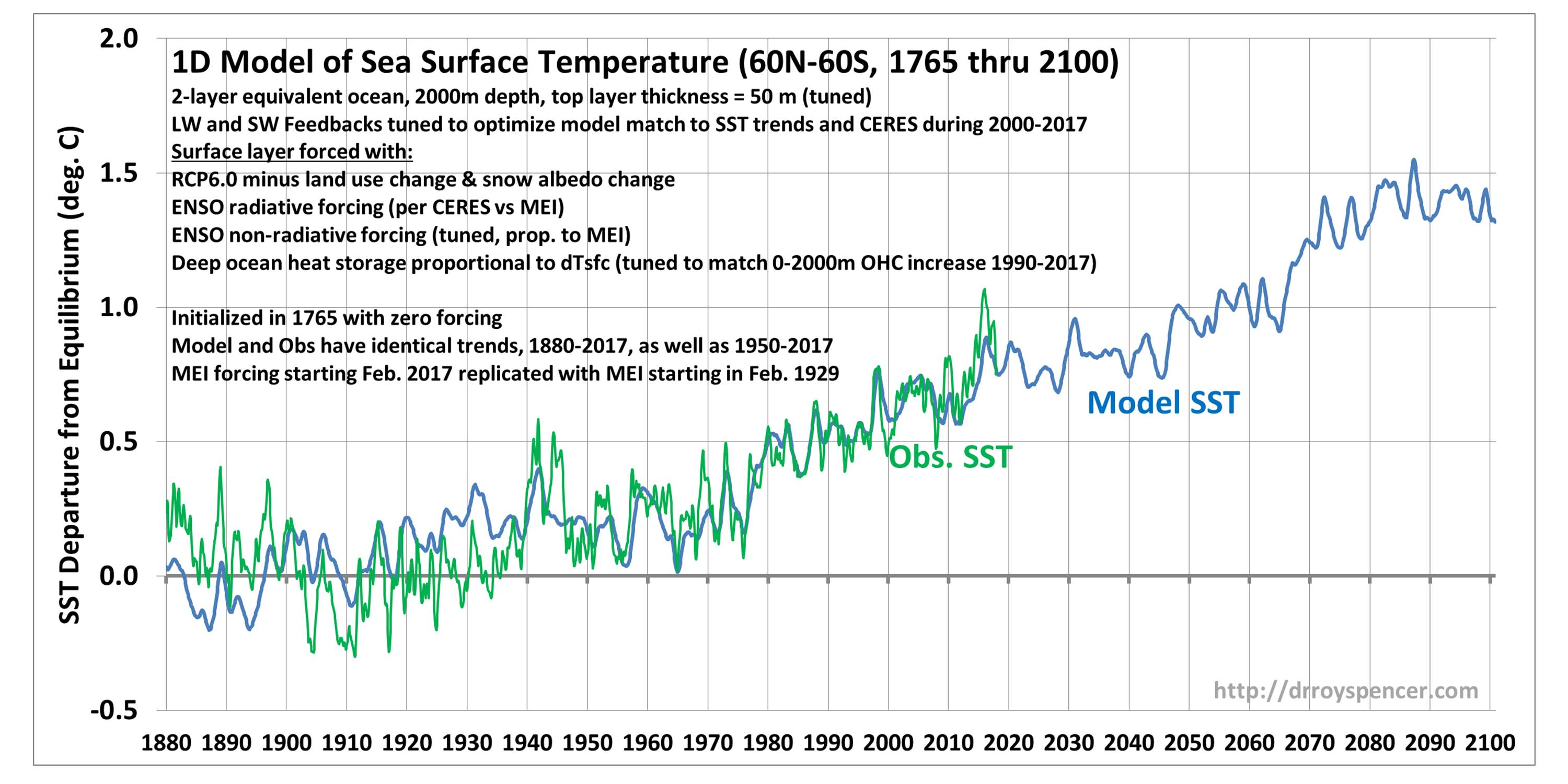 While that model was meant to match global average (land+ocean) conditions, I more recently did one for oceans-only (60N-60S). I changed a few things, so the models are not directy comparable. For example, I used all of the RCP6.0 radiative forcings, but with the land use and snow albedo changes removes (since the model is ocean-only). For SST observations, I used the ERSSTv5 data.