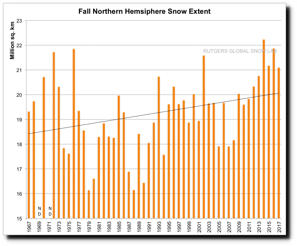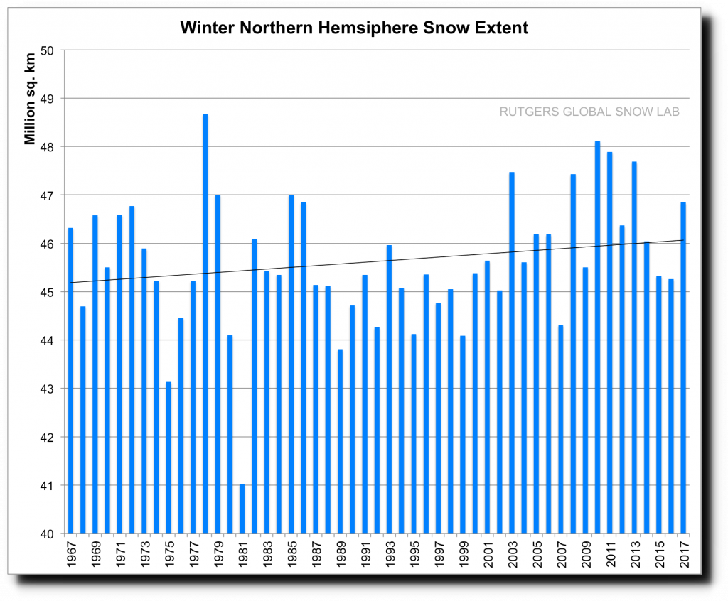 Autumn and winter snow cover has been increasing across the northern hemisphere for 50 years, indicating that cold Arctic air is penetrating further and further south.