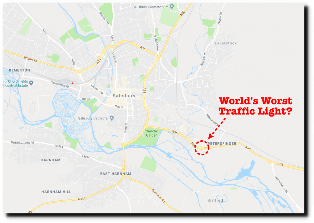 I travel to Salisbury, UK just about every year. Besides their chemical weapons facility where they exposed thousands of Brits to nerve gas, they have an original copy of the Magna Carta – and possibly the world’s worst traffic light. Driving in from the southeast on the A-36 you can get stuck quite literally for hours at an incredibly badly timed traffic light. I guess it keeps the Russian spies out.