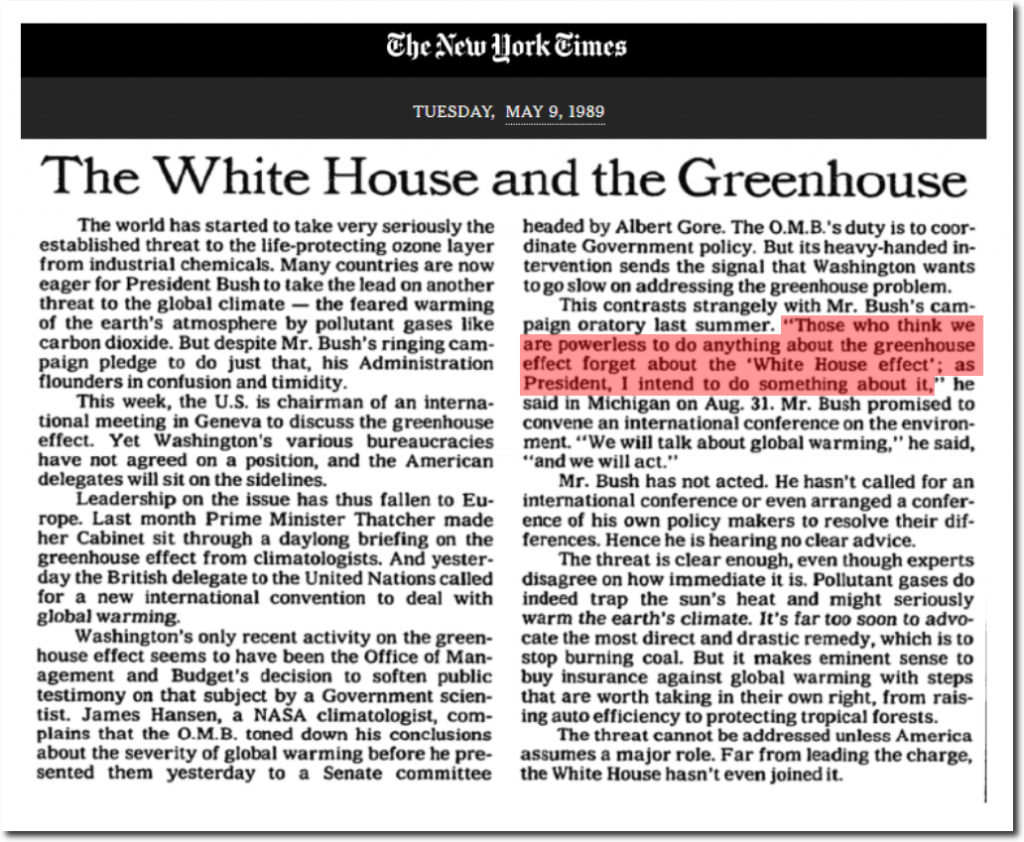 ”Those who think we are powerless to do anything about the greenhouse effect forget about the ‘White House effect’; as President, I intend to do something about it,”