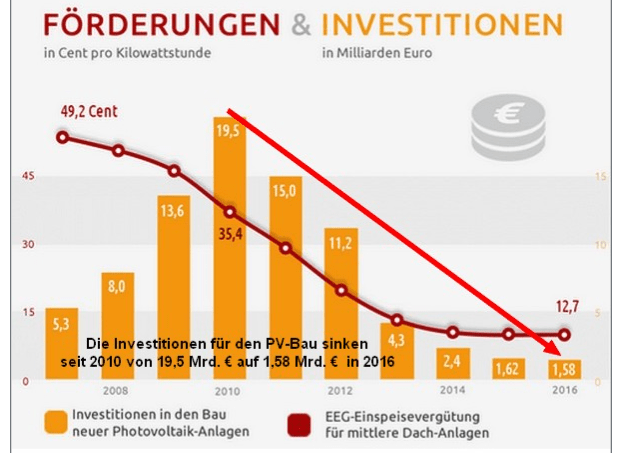 Although solar systems are generally much cheaper, they are much less attractive as investments. While 19.5 billion euros were invested (Investitionen) in solar systems in 2010, only 1.58 billion euros were invested in 2016!