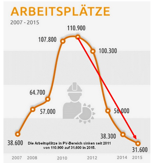 Finally the fourth chart depicts the number of jobs (Arbeitsplätze) in the German solar industry. Here we clearly see a bloodbath.