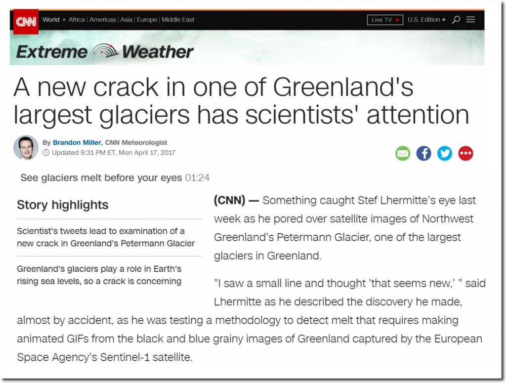 Last year, fake news CNN’s meteorologist breathlessly reported on “a new crack” in Greenland’s Petermann glacier, under the heading of “Extreme Weather.”