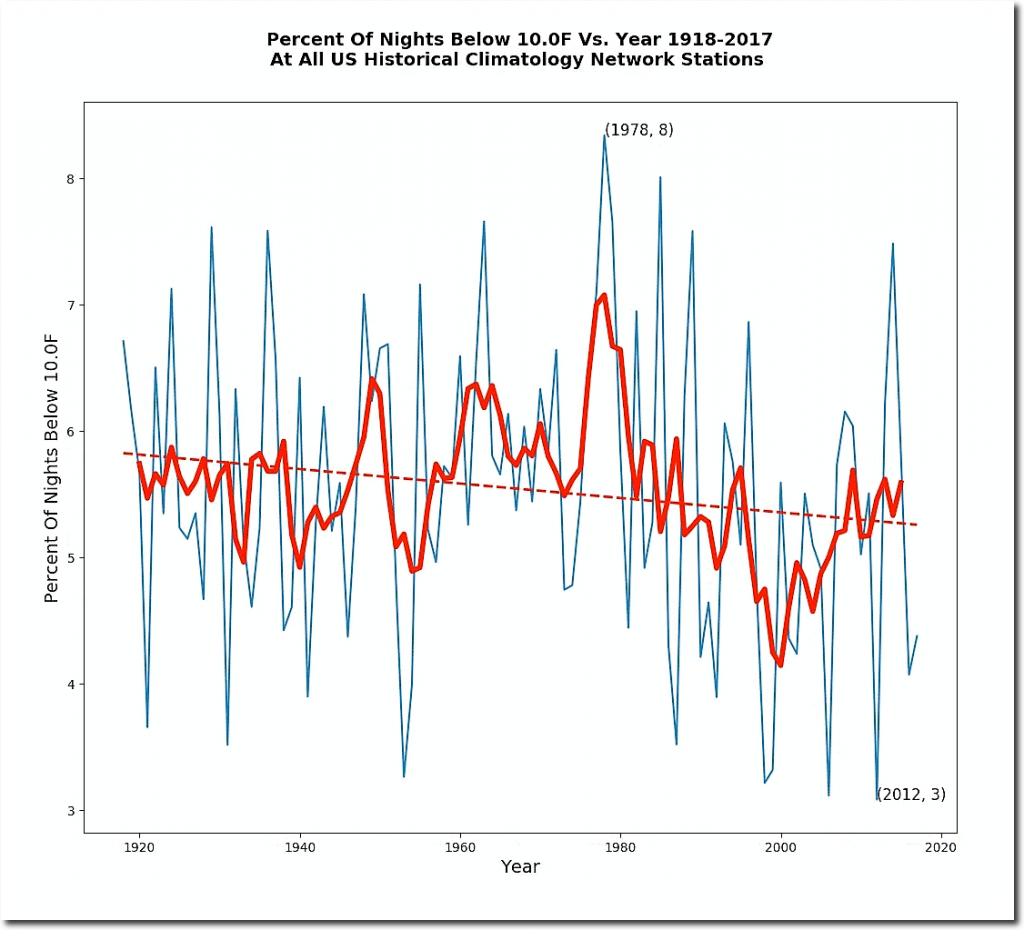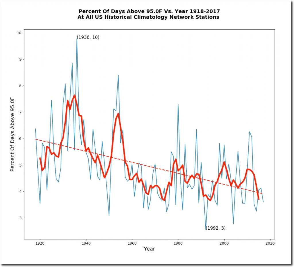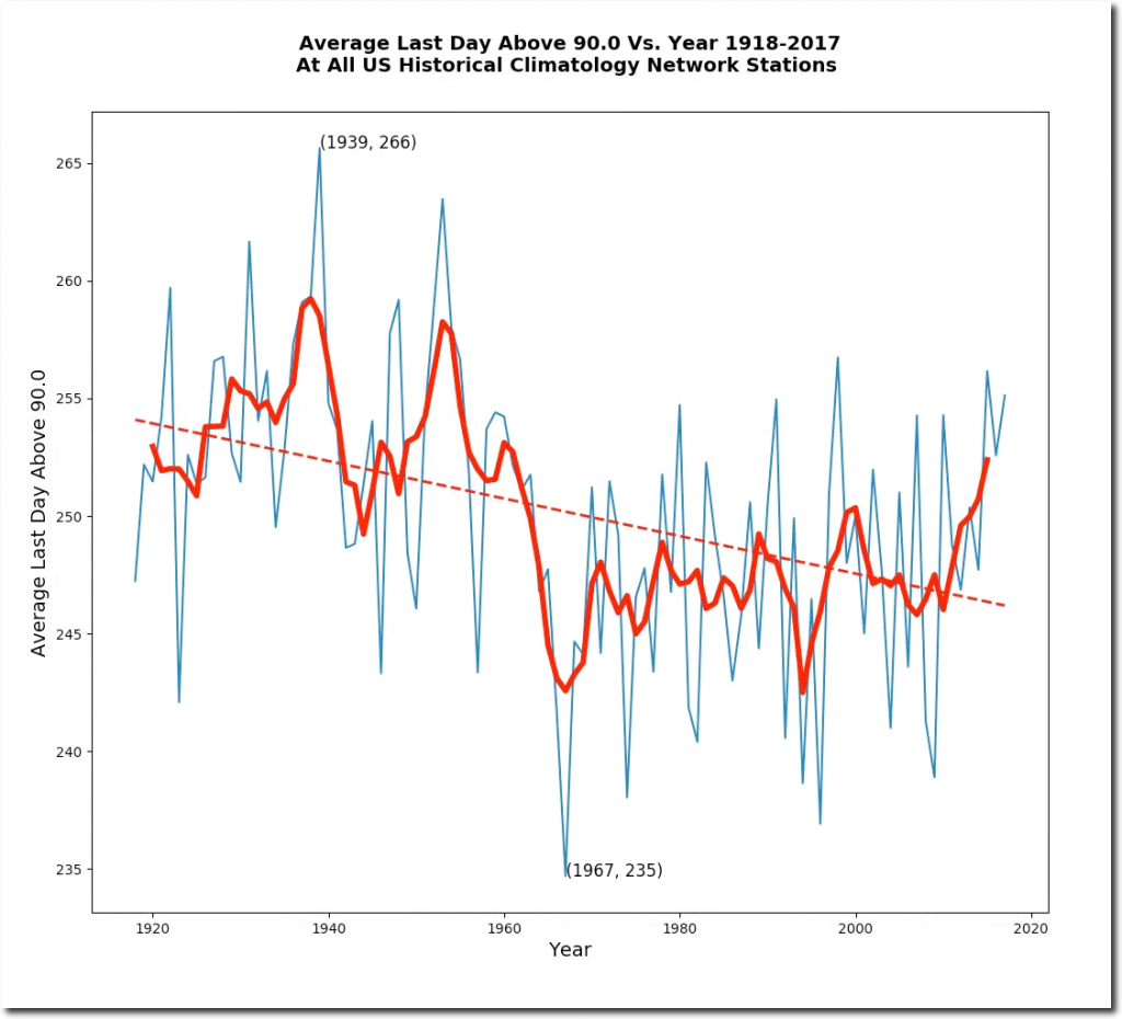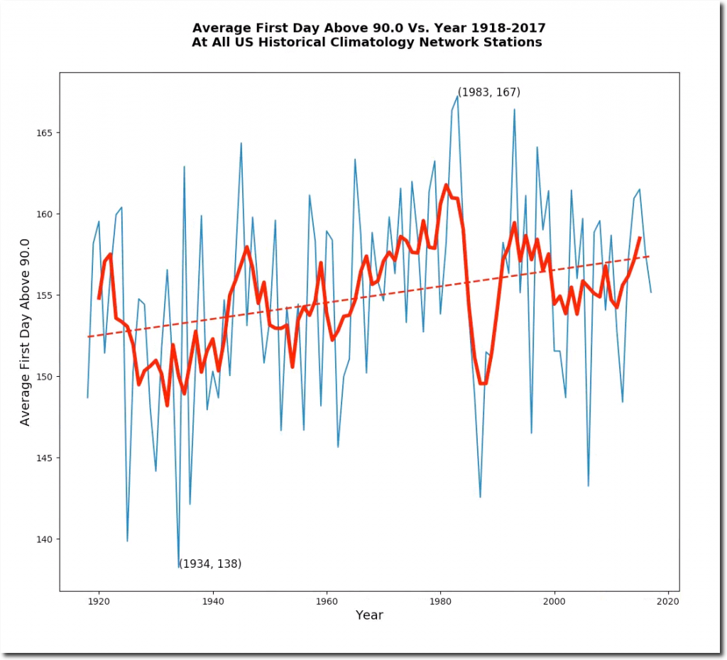 Over the last century, the number of both hot and cold days has declined in the US. The first hot day is coming later, and the last hot day is coming earlier. Claims that the climate is becoming more extreme are based on junk science from NOAA, and superstition.