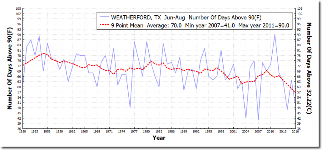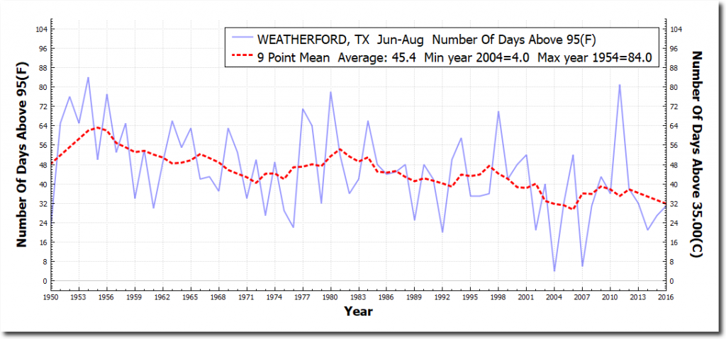 The USHCN station at Weatherford, Texas is the closest station to the Dallas-Fort Worth area. Over the last 70 years, the frequency of hot days and average afternoon summer temperatures at Weatherford have declined.
