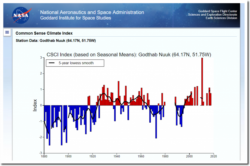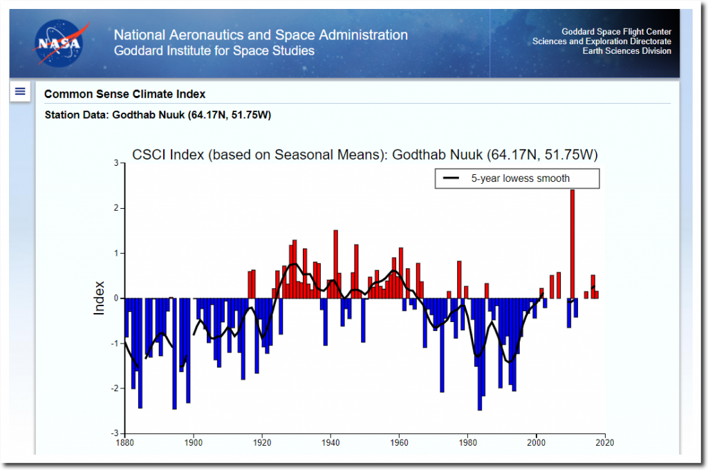 Before they tamper with the data, NASA’s “Common Sense Climate Index” shows the capital of Greenland much warmer from 1920 to 1960 than it is now.