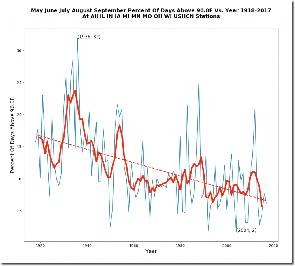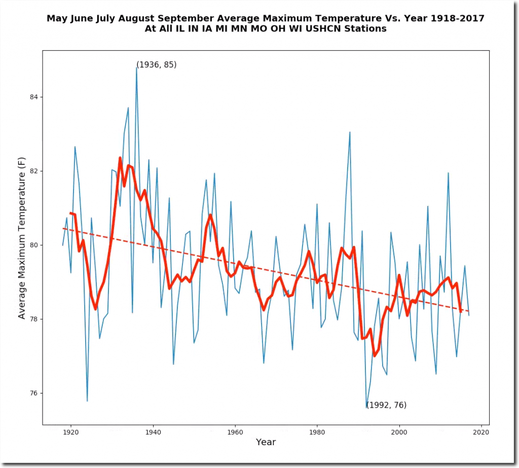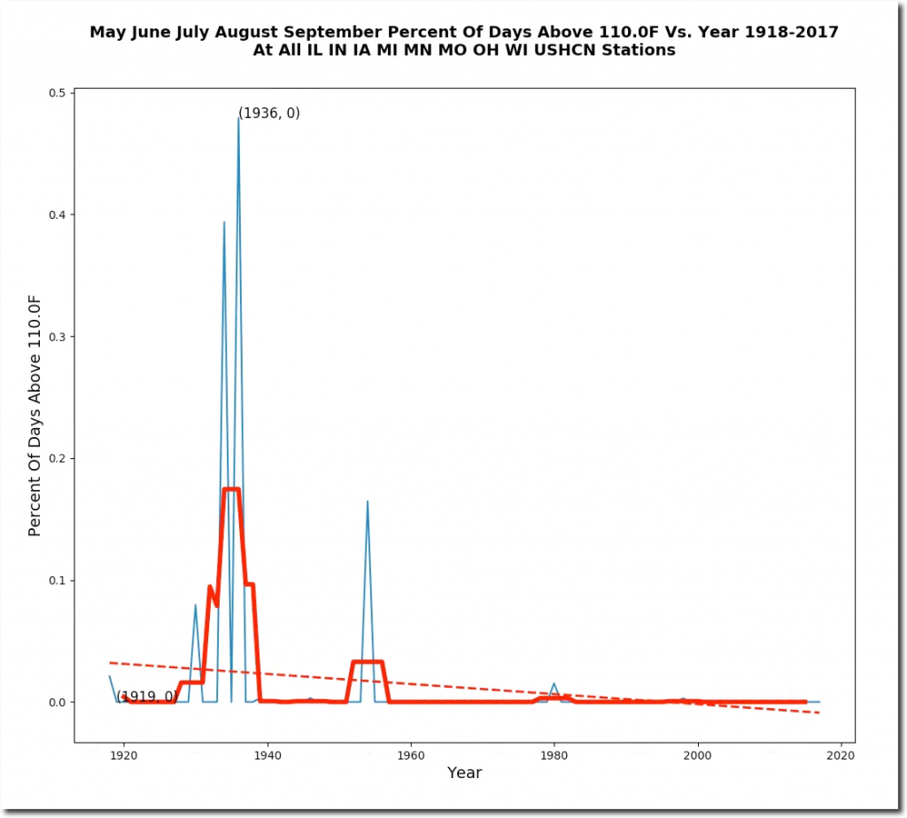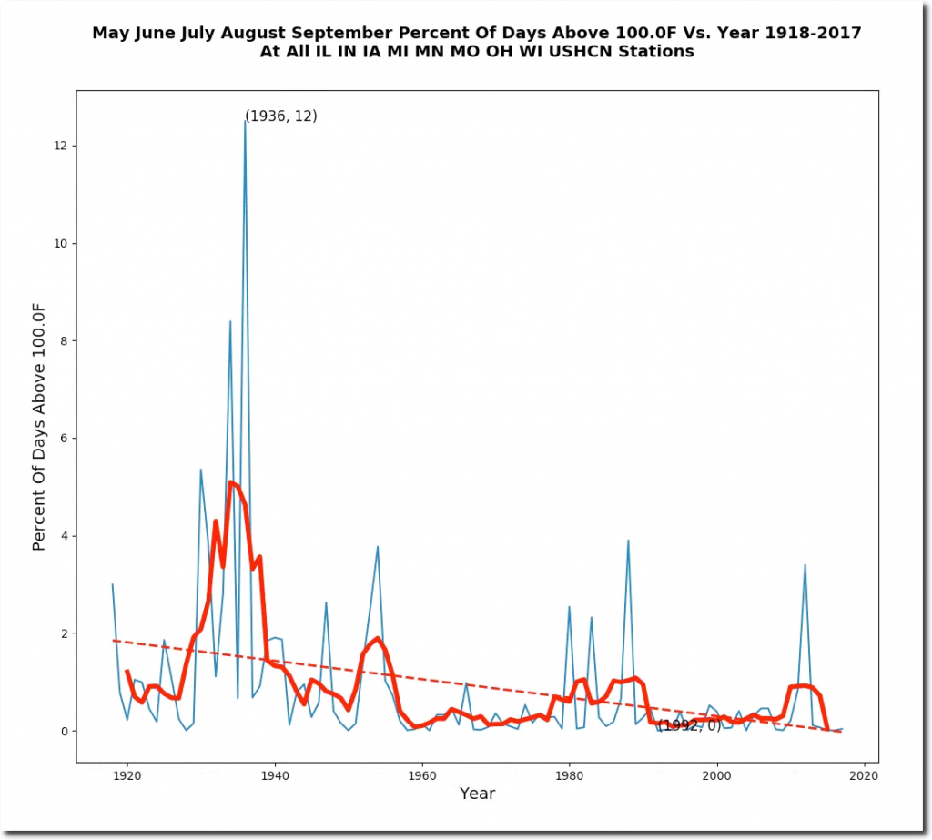 The Midwest hardly ever reaches 100 degrees anymore, but from May 28 to August 19, 1934 the Midwest was over 100 degrees on more than 85% of days. Here is an animation of the May 28 to June 3, 1934 heatwave.