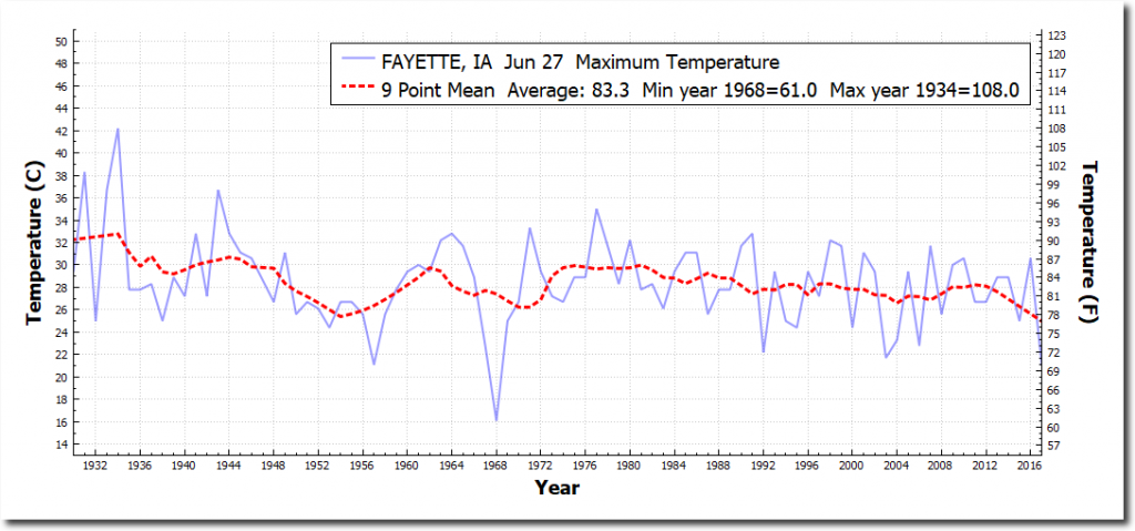 June 27 temperatures at Fayette have dropped about ten degrees since 1930, and today’s “Excessive Heat” forecast is just above the long mean, and 22 degrees cooler than 1934.