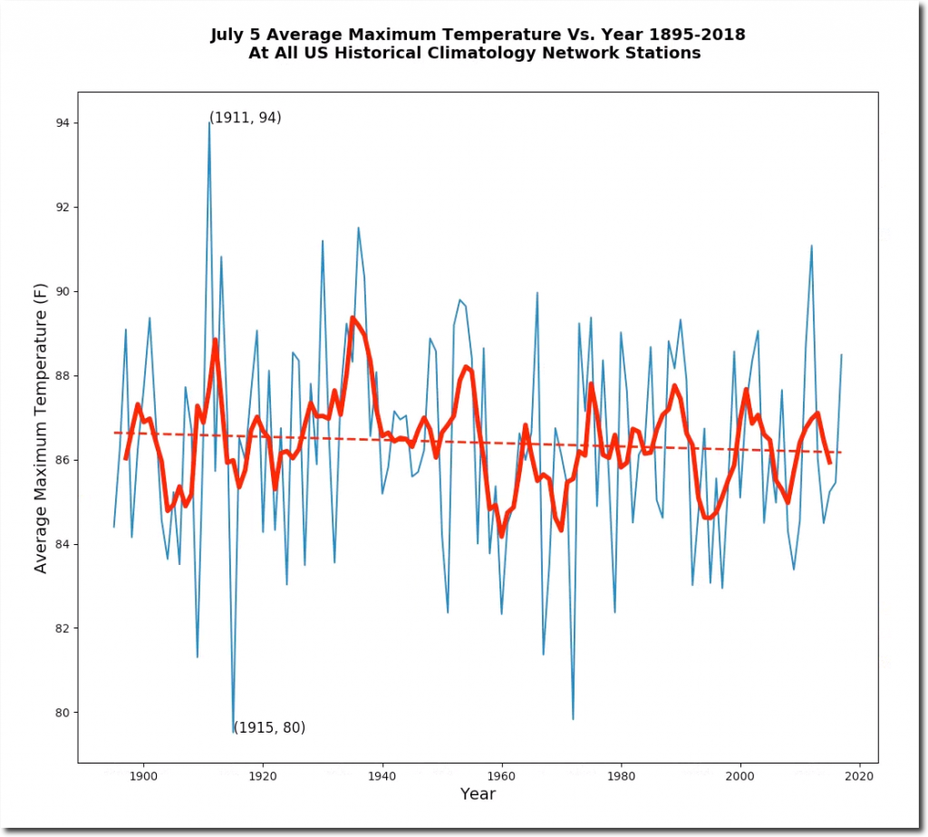 The hottest July 5th occurred in 1911. with 100 degree temperatures into New England.