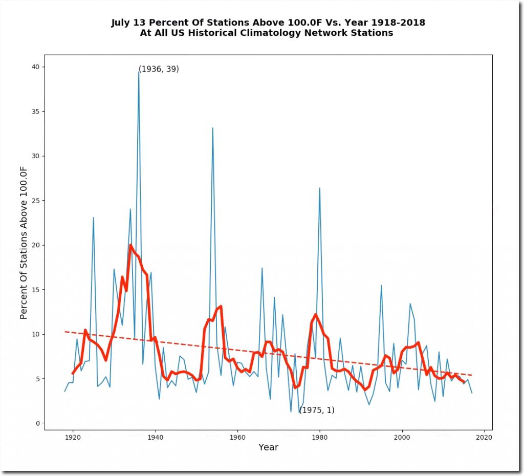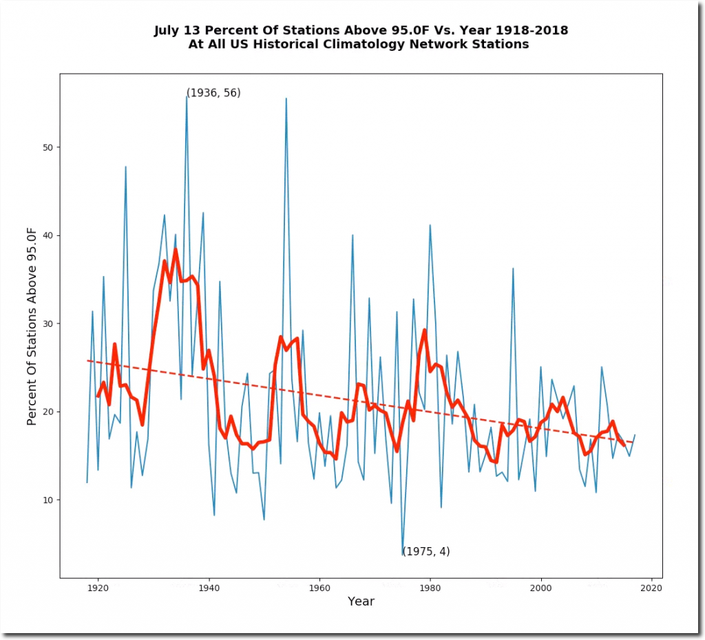 July 13th afternoon temperatures have been plummeting in the US for a century.