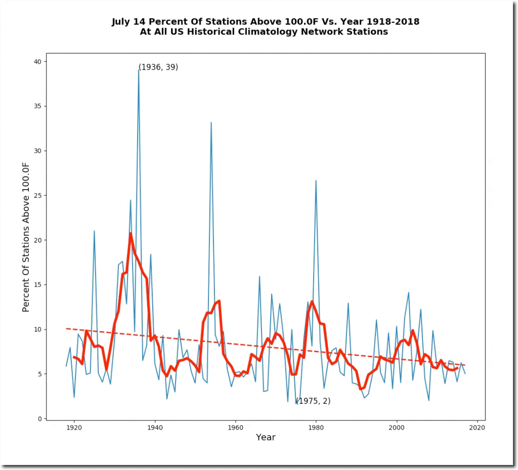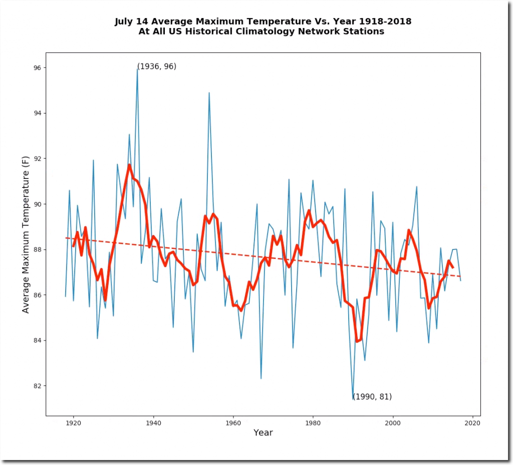 July 14 maximum temperatures have declined in the US over the past century, as has the frequency of hot days.
