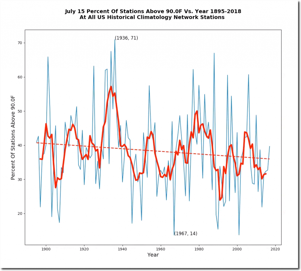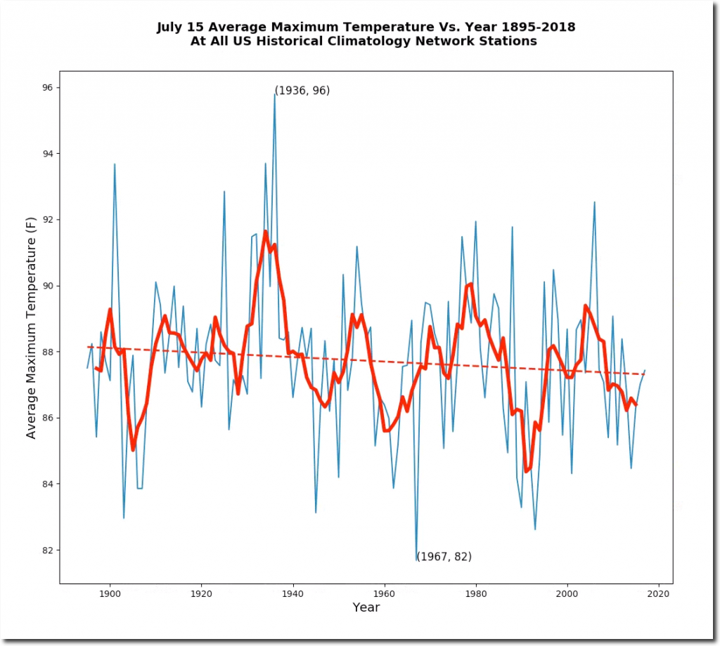 On July 15, 1936 the average maximum temperature around the US was 96 degrees. It was 118 degrees in Missouri, 115 in Kansas, 114 in Oklahoma, 113 in Iowa, Illinois, Indiana and South Dakota, and 111 in Minnesota and Kentucky,