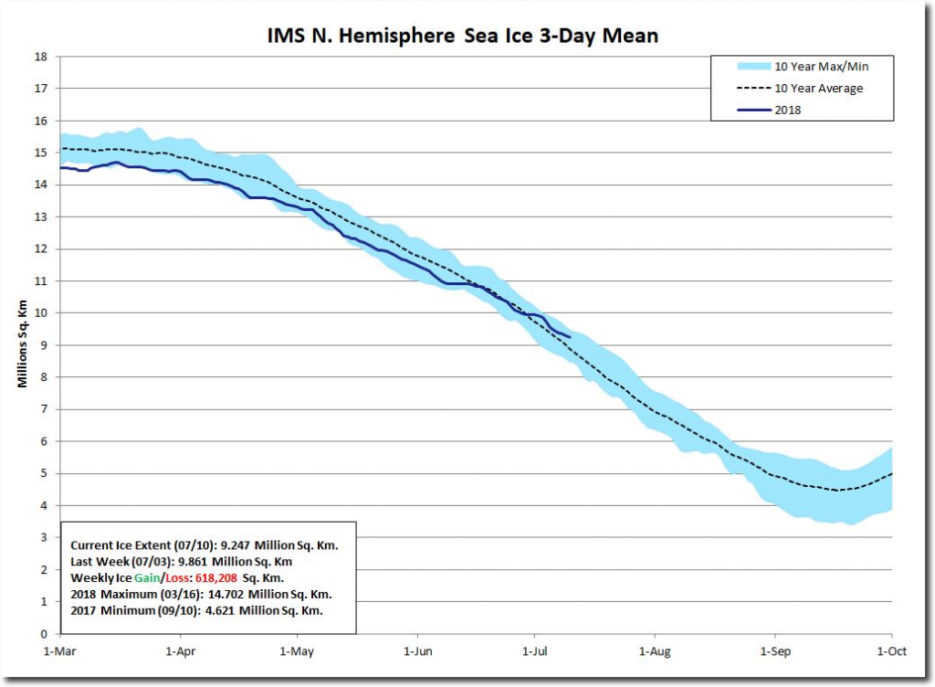 Arctic sea ice extent is declining very slowly, and is above the 10 year average.