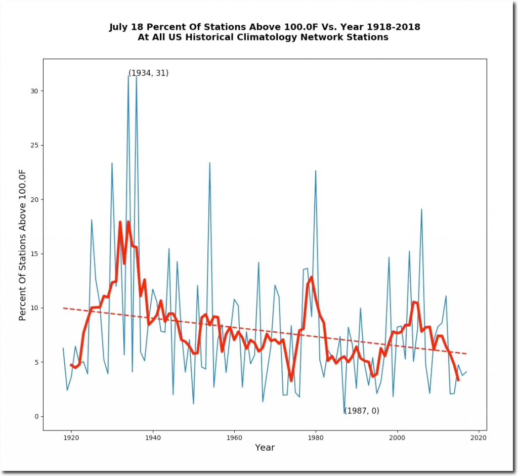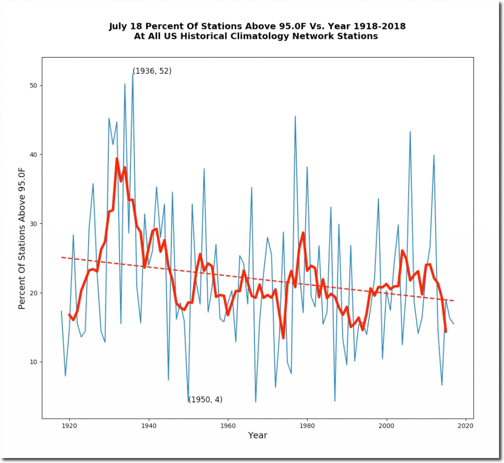 July 18 maximum temperatures have declined in the US over the past century, and the frequency of hot days has plummeted.
