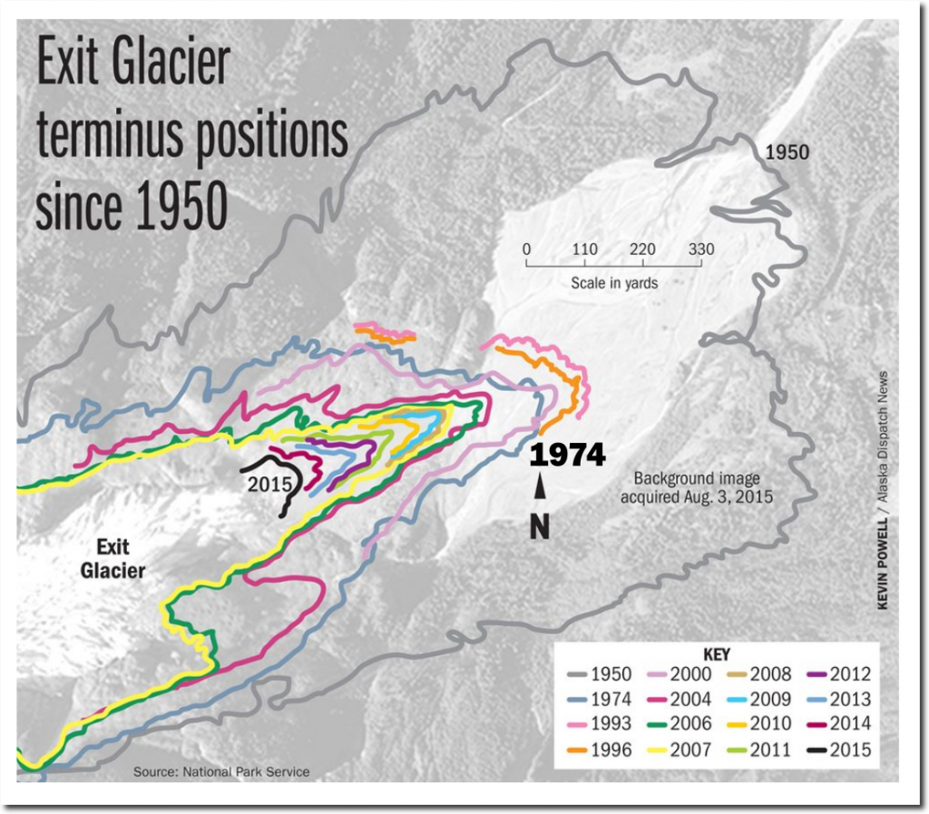 In a sense, Obama was correct – the Exit Glacier was retreating much faster one hundred years ago than it is now.