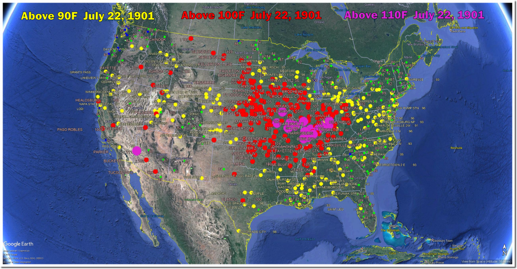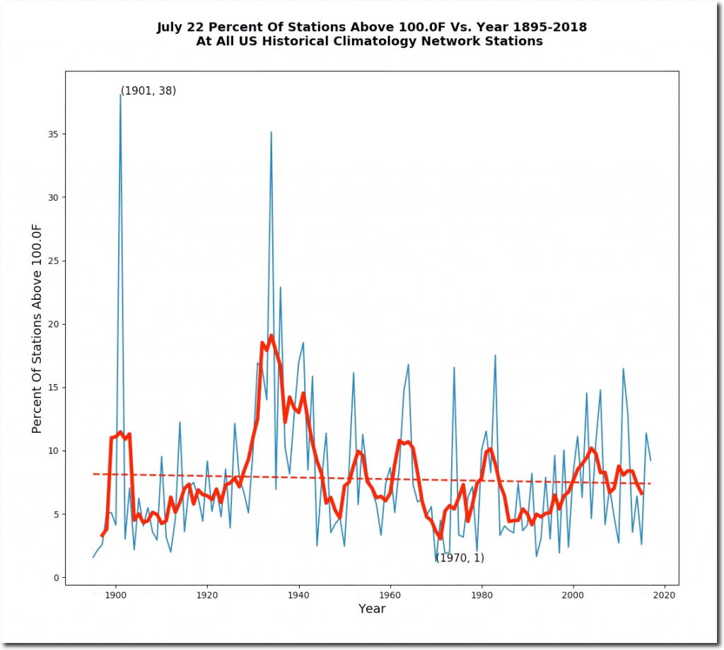The hottest July 22nd was in 1901, with the average afternoon temperature across the US at 96 degrees. It was 112 degrees in Illinois and Indiana, and 110 degrees in Iowa and Wisconsin.