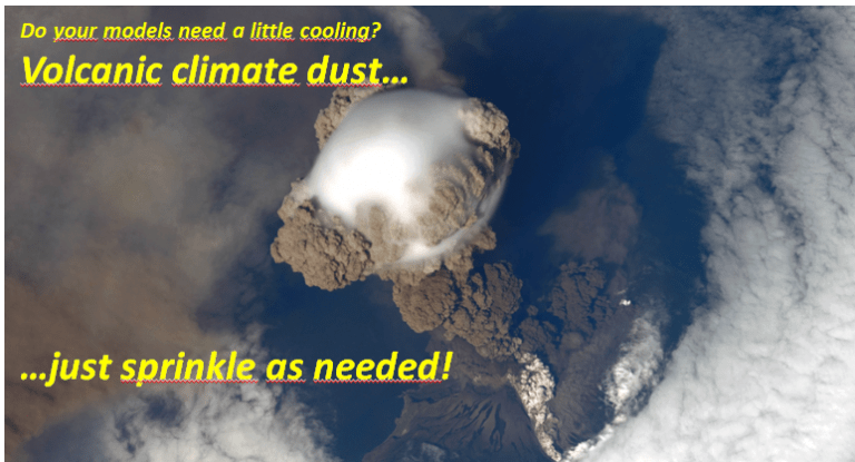 Under the bottom line the authors concede nothing to climate variability. Instead the volcano card gets played when all else fails. Whenever there’s need for some cooling, volcanic dust gets sprinkled in the computer climate world.