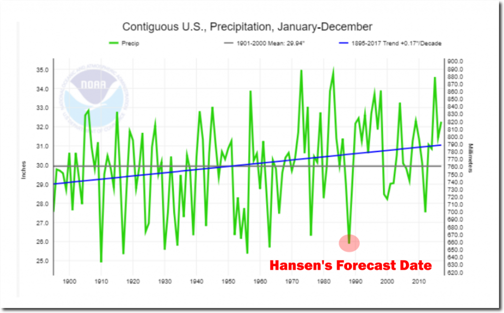 The 1950’s had the most persistent droughts on record, with the US in drought about 50% of the time, not 5% as Hansen claimed Since then, and particularly since Hansen’s 1988 forecast, the US has been getting and wetter and droughts have become infrequent.