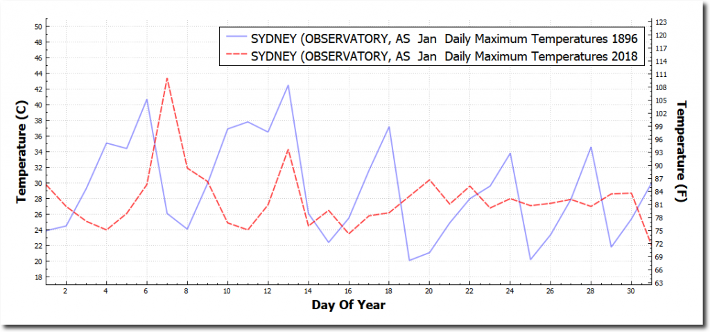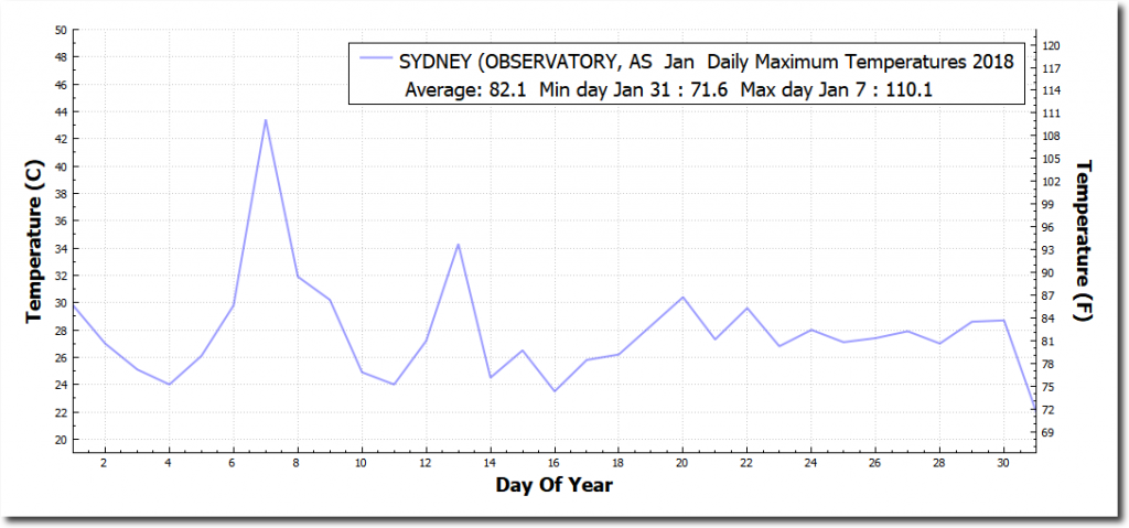 The hottest official temperature in Sydney was 110 degrees. January maximum temperatures in Sydney averaged a blistering 82 degrees, three degrees cooler than January 1896.