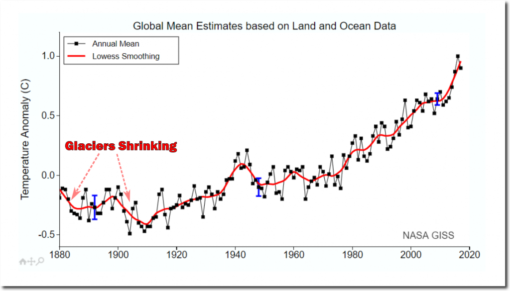 Glaciers shrunk thousands of feet in the late 19th century, as temperatures cooled towards NASA’s fake coldest years on record.