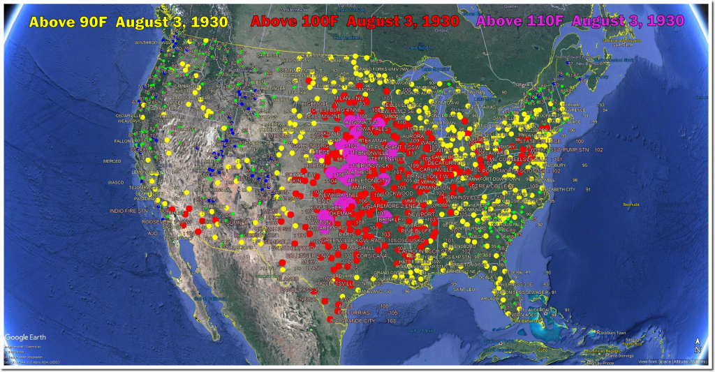 On this date in 1930, it was 113 degrees in Nebraska; 112 in South Dakota, Oklahoma and Kansas; 111 in Missouri, 110 in Iowa and Arkansas, 109 in Minnesota, 108 in Illinois and 106 in Virginia. Average maximum temperature around the US was 94 degrees. There were 100 degree temperatures coast to coast. CO2 was below 310 PPM.