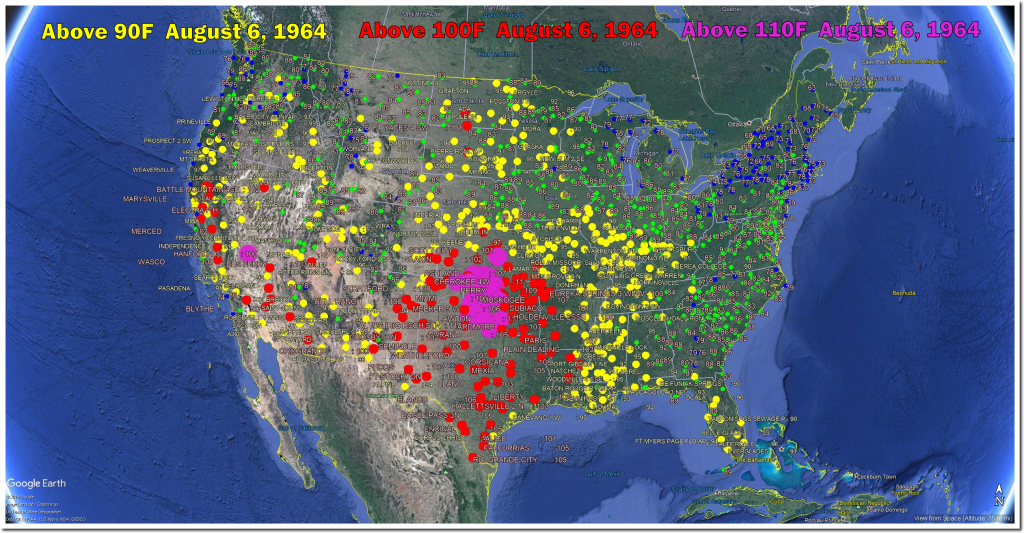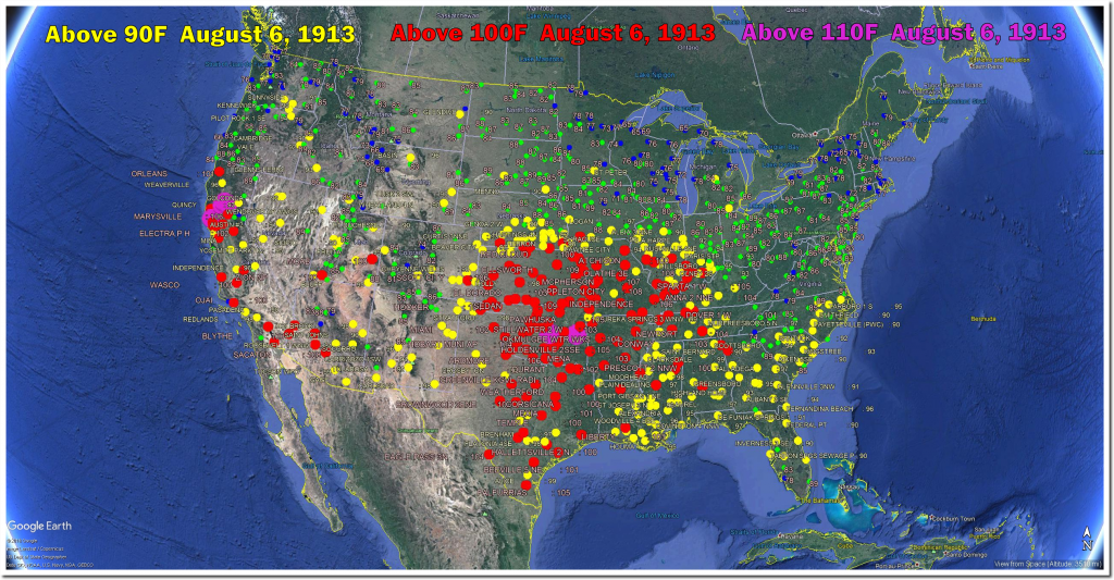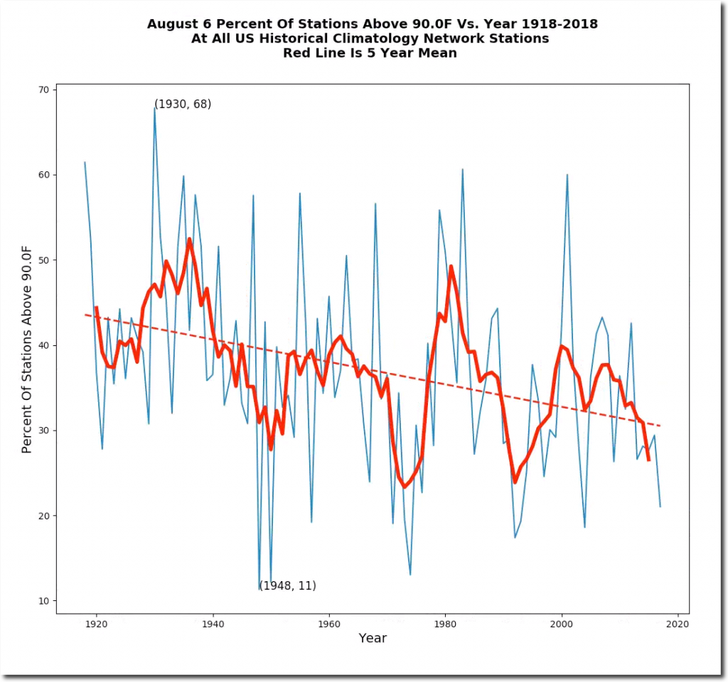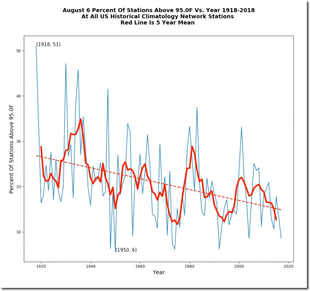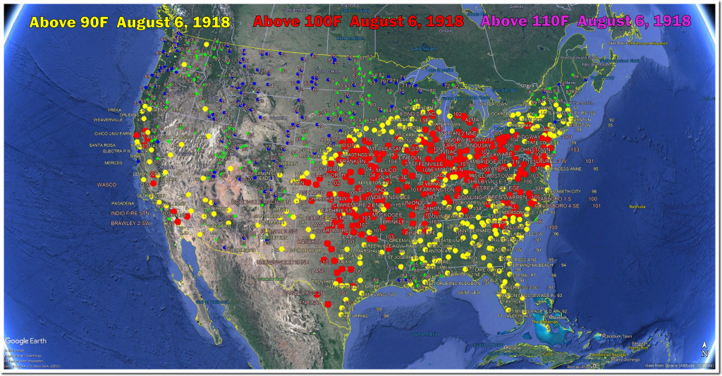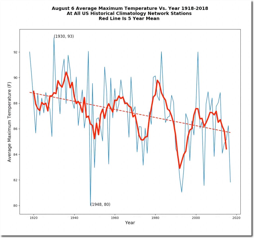 August 6th afternoon temperatures have plummeted in the US over the past century. August 6th, 1918 tied for the hottest day on record in Maryland at 109 degrees. One third of the US was over 100 degrees that day, and more than one half of the US was over 95 degrees.