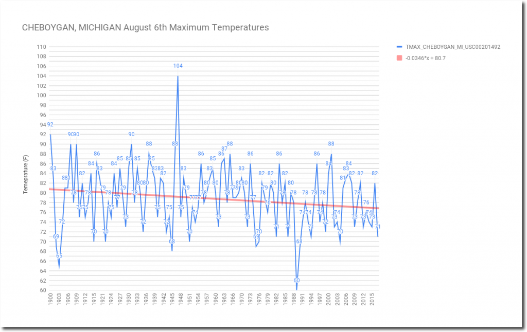 August 6th afternoon temperatures have dropped four degrees since 1900 at Cheboygan, Michigan. On this date in 1947 it was 104 degrees there. Today’s forecast is 26 degrees cooler.