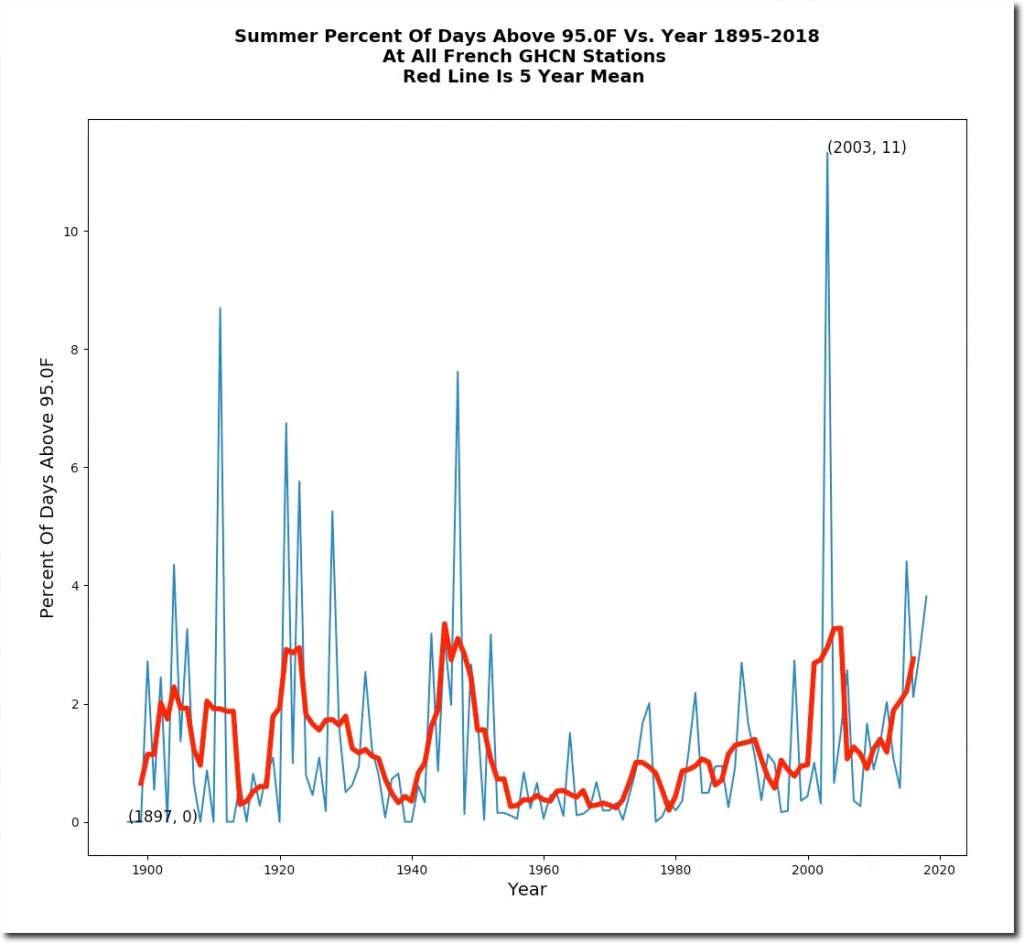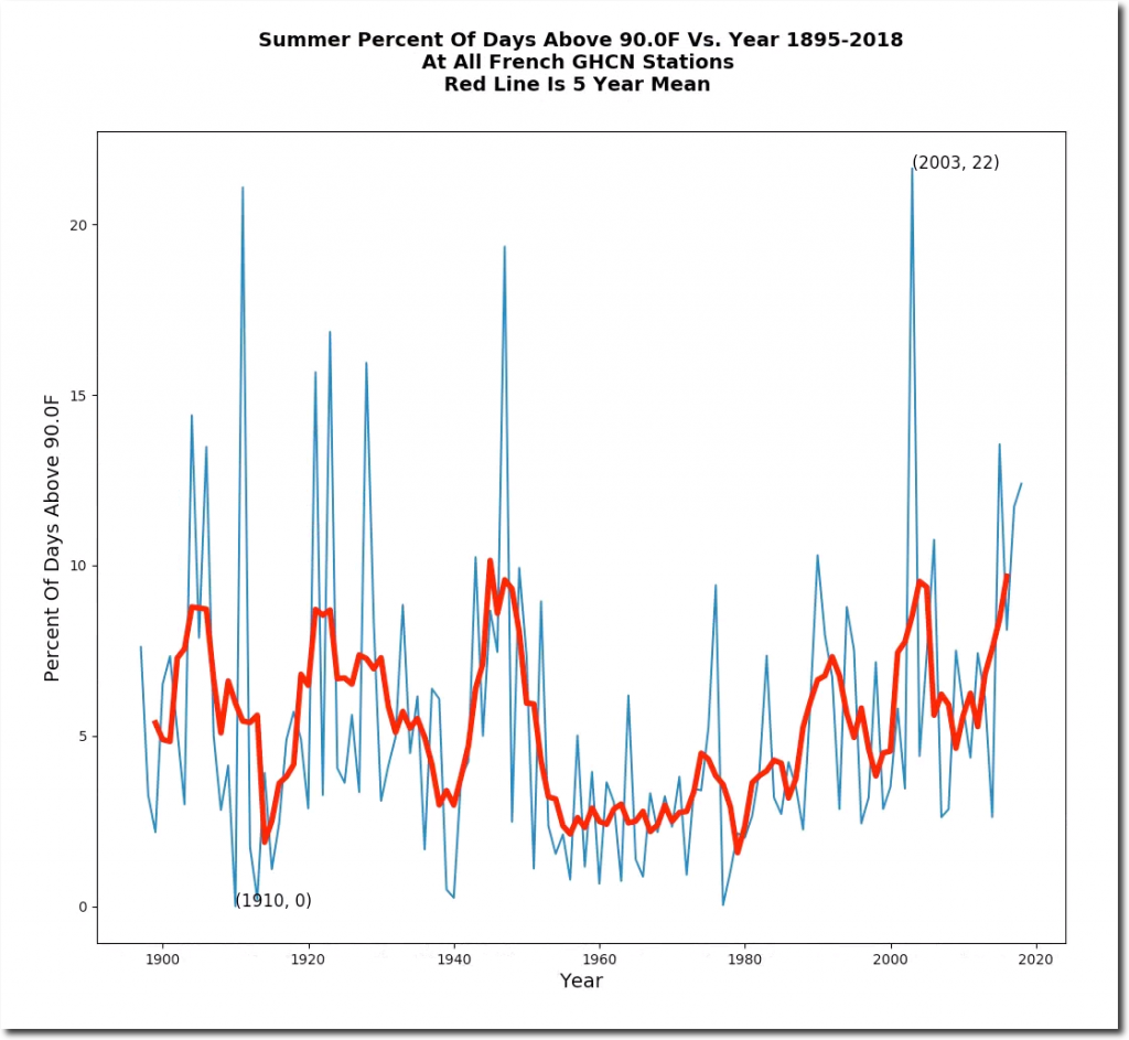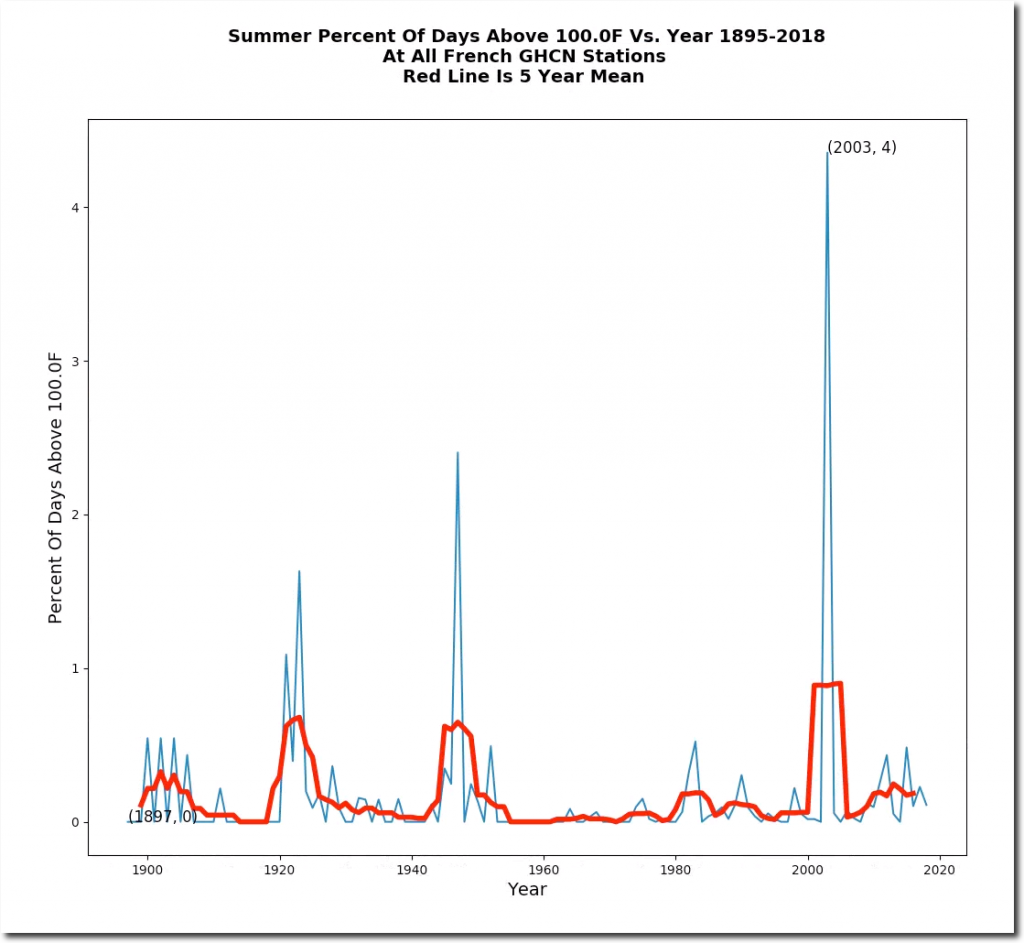 The average afternoon summer temperature in France is about the same as 100 years ago, as is the frequency of hot days.