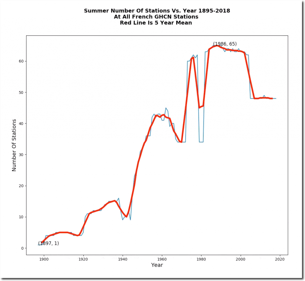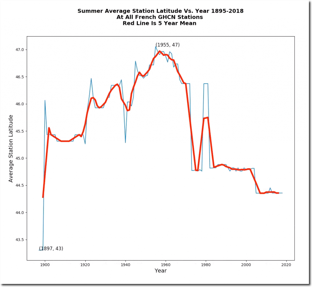 The number of stations has increased quite a bit, and the average latitude has moved towards the equator by more than two degrees, which probably accounts for the entire warming trend since 1955. This is the sort of garbage in the GHCN record which makes the global temperature record meaningless.