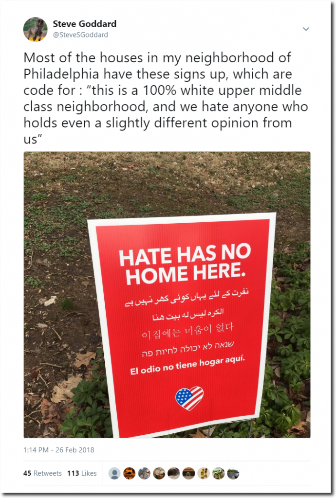 Q. What kind of people put a sign in front of their house with the word “HATE” in bold, capital letters?