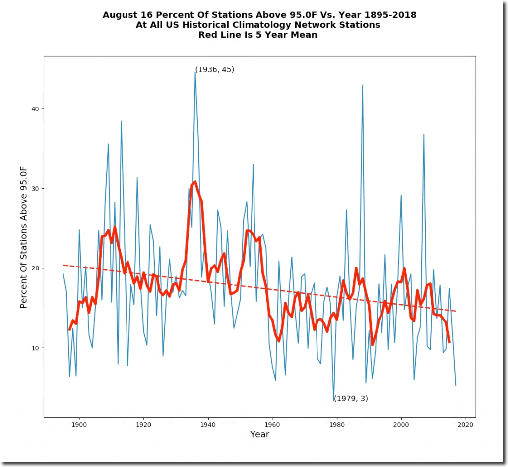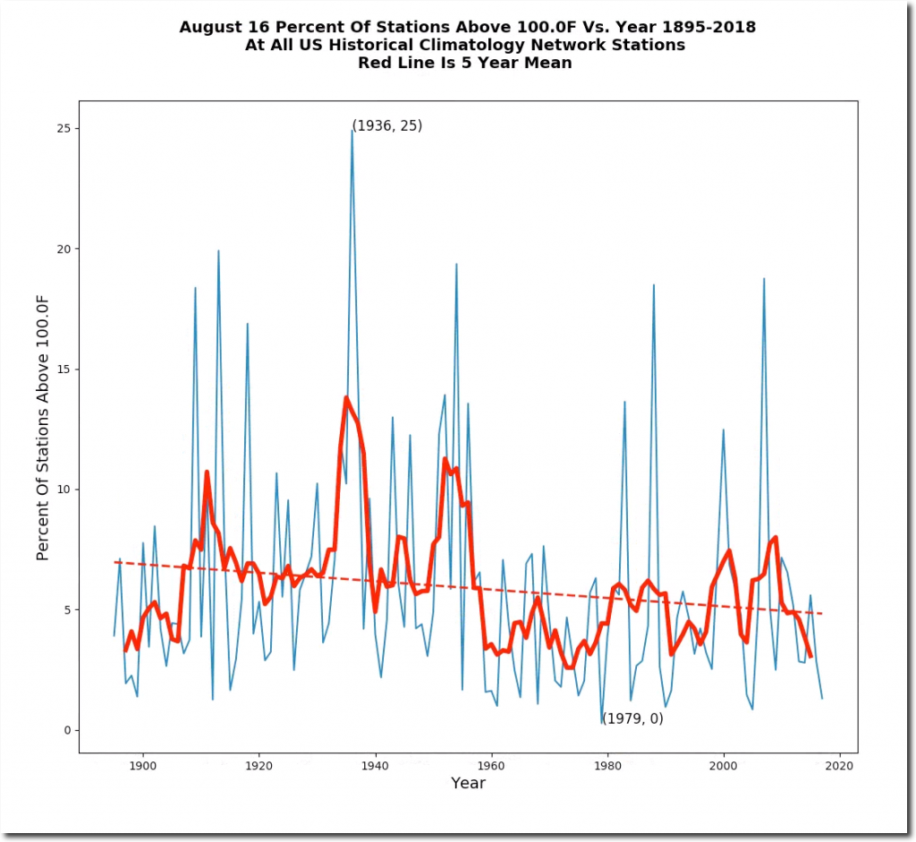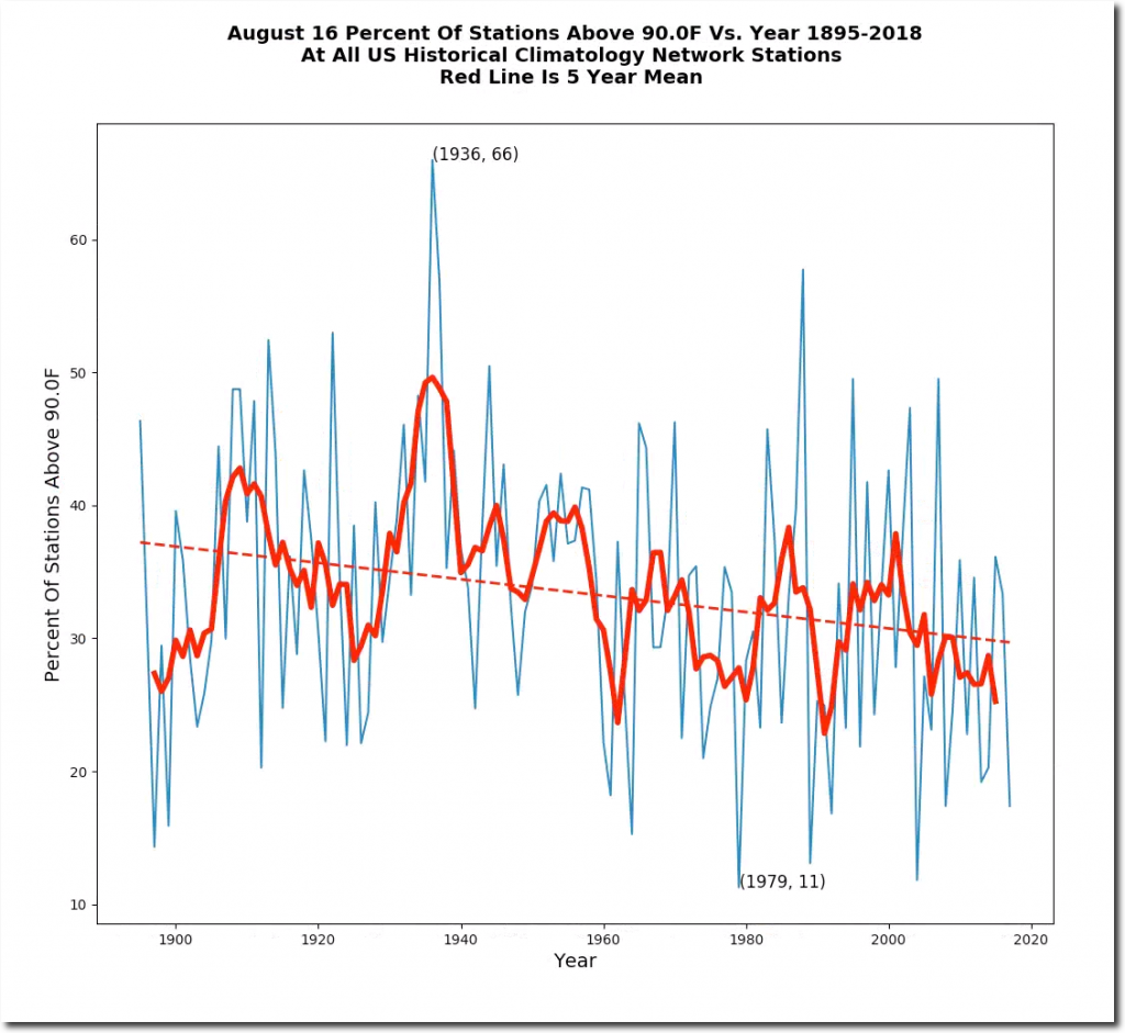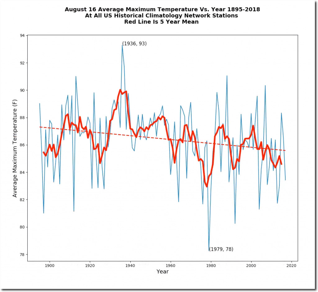 August 16 afternoon temperatures have plummeted in the US over the past century.
