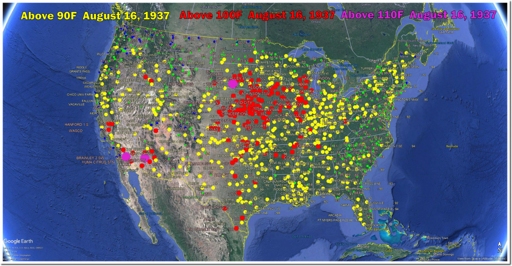 On this date in 1936, the average maximum temperature in the US was 93 degrees, and two thirds of the US was over 90 degrees. Missouri, Nebraska, Kansas and Oklahoma were all over 110 degrees.