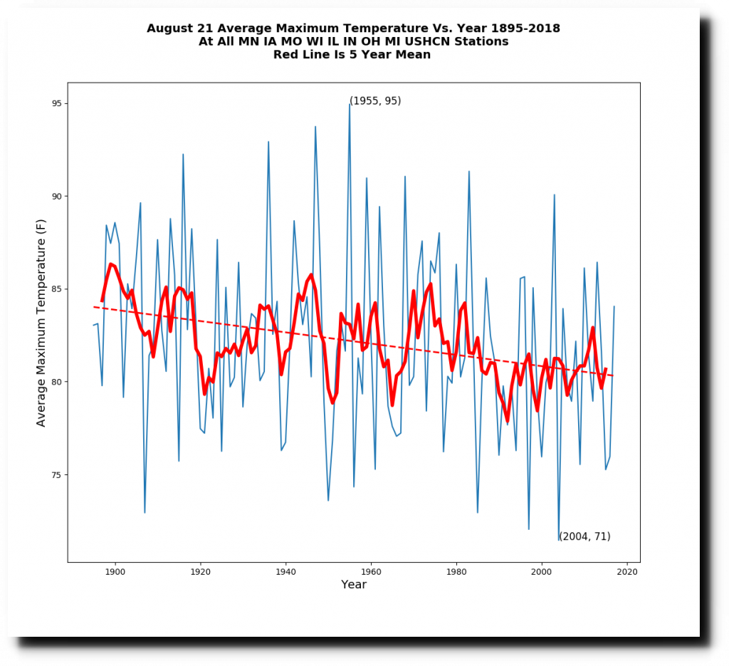 August 21 used to be a hot day in the Midwest, but has cooled dramatically over the last century. There hasn’t been a 100 degree day in the Midwest in 15 years, but they used to be quite common. On this date in 1900, Du Quoin, Illinois was 111 degrees.