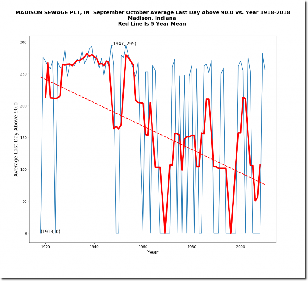 September/October afternoon temperatures have dropped more than five degrees over the last century at Madison, Indiana.